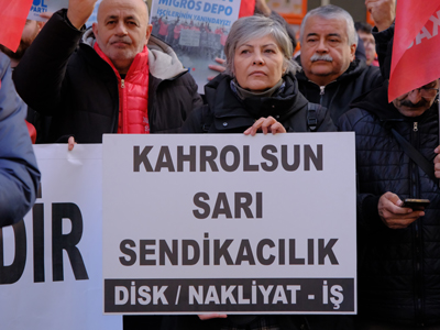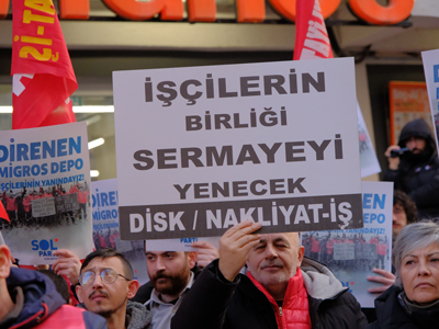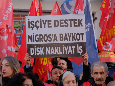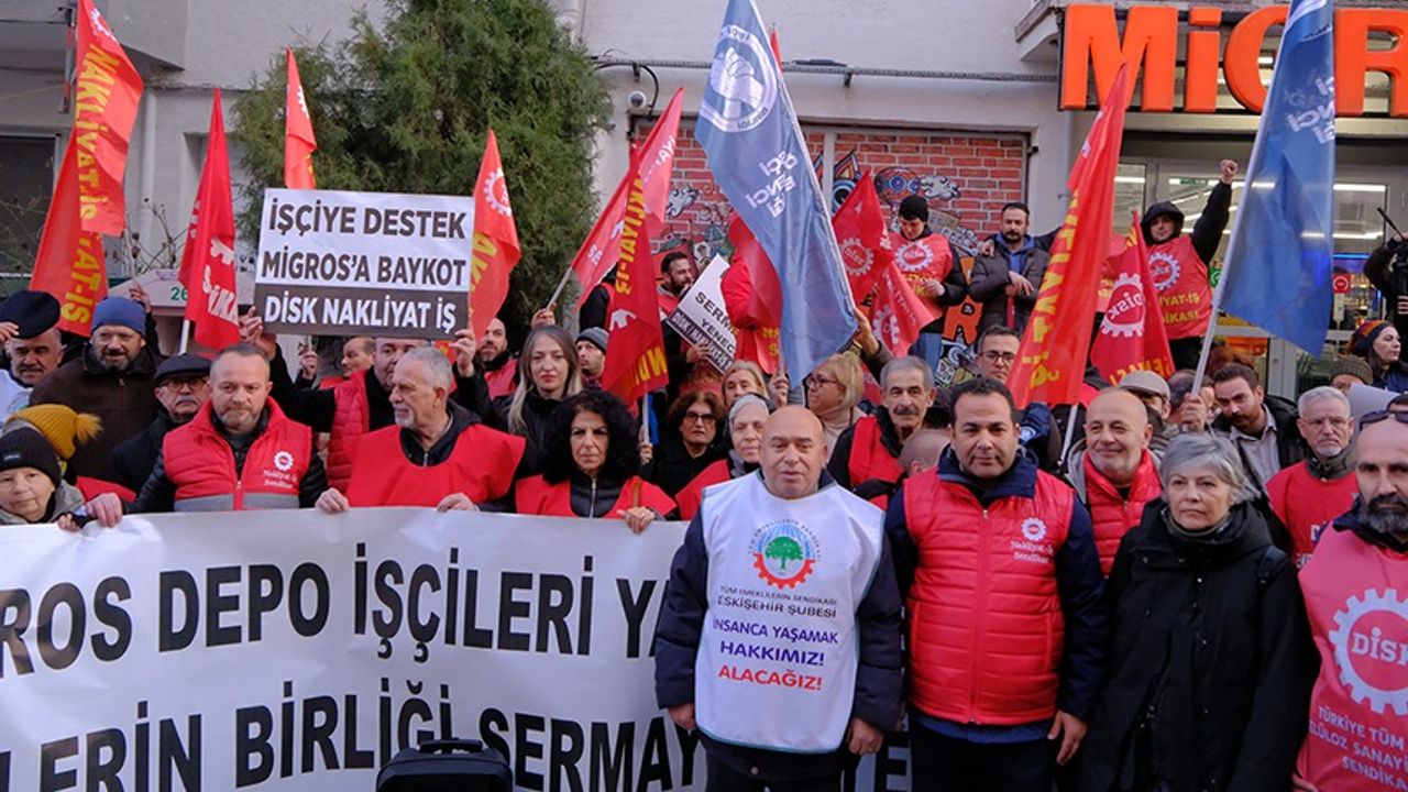 Eskişehir’de, iş akitleri feshedilen 114 depo işçisine destek vermek amacıyla bir araya gelen sendika üyeleri, Migros mağazasında “kasa kilitleme” eylemi gerçekleştirdi. Kızılcıklı Caddesi üzerinde bulunan bir Migros mağazası önünde toplanan DİSK/Nakliyat-İş Eskişehir Şubesi üyelerine; Tüm Emeklilerin Sendikası ve DİSK Emekli-Sen temsilcileri de destek verdi. “İşçiye Destek Migros’a Boykot”, “Migros İşçisi Yalnız Değildir” ve “Kahrolsun Sarı Sendikacılık” sloganları atan grup, basın açıklamasının ardından mağazaya girerek kasalarda işlem yapmayı durdurdu.