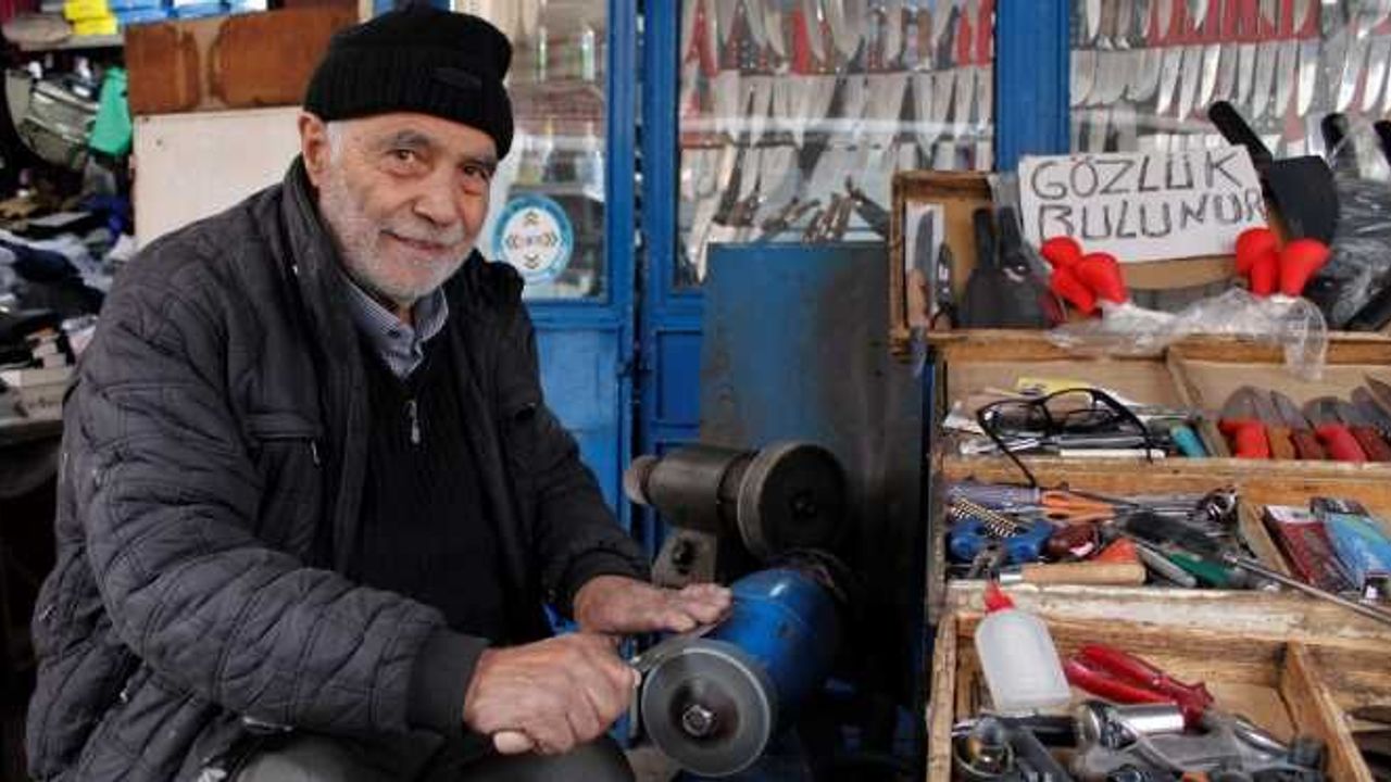 'Çalıştığımız bölgede yıllardır bir değişiklik görmedim. Sadece dükkanın önünden bir su kanalı geçiyordu, onun da üstünü kapattılar. Yani anlayacağınız aynı tas aynı hamam. Elhamdülillah biz senelerdir bu bölgede çalışıyoruz ve karşılığını da alıyoruz. Ben tezgahımda bıçak biliyorum, sap takıyorum ve ne gerekiyorsa tamiratını yapıyorum. Bir bıçağı teslim aldığımda 3 ayrı makineden ve toplam 5 adet bileme taşından geçiyorum. Benim sistemim Eskişehir'de tektir. Eskiden usturalar da bilerdim, fakat şimdi elime çok gelmiyor. Ara sıra ağzı dönen veya eğilen bıçaklar da geliyor, onları da çekiçle düzeltip teslim ediyorum.'