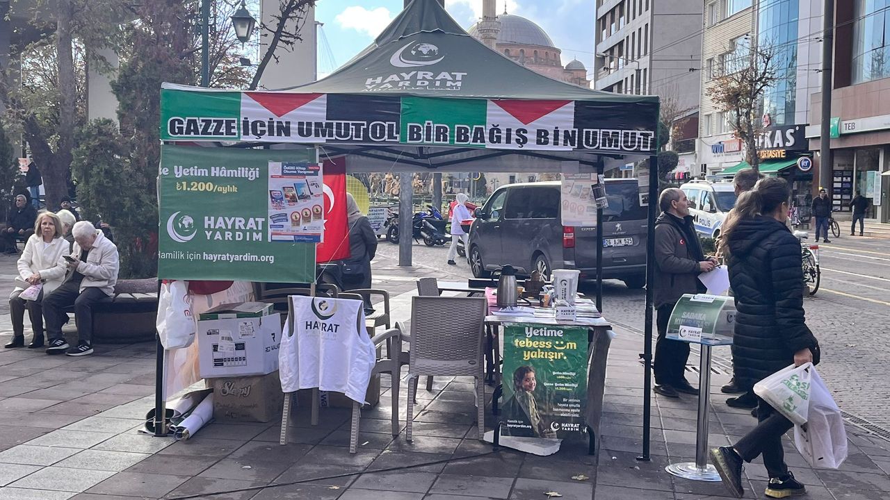 Hayrat Yardım Derneği tarafından Gazze’ye destek amacıyla bir bağış standı kuruldu. Üzerinde “Gazze için umut ol, bir bağış bin umut” yazılı afişlerin yer aldığı stant, gün boyunca vatandaşların ilgisini çekti. Standın önünde derneğin çeşitli kampanyalarına dair bilgilendirici broşürler, bağış kutuları ve destek programlarını tanıtan görseller yer aldı. Görevliler, özellikle Gazze’de yaşayan sivillerin temel ihtiyaçlara ulaşmakta zorlandığını belirterek yapılacak her bağışın büyük önem taşıdığını söyledi. Standın bir diğer bölümünde ise derneğin “Yetim Hâmiliği” programı tanıtıldı. Program kapsamında, bir yetimin aylık bin 200 TL ile düzenli olarak desteklenebileceği anlatıldı. Görevliler, bu desteğin çocukların gıda, eğitim ve temel ihtiyaçlarını karşılamada büyük katkı sunduğuna dikkat çekti. Hayrat Yardım gönüllüleri, Eskişehir’de bu tür stantların düzenli olarak kurulduğunu, amacın hem farkındalık oluşturmak hem de ihtiyaç sahiplerine hızlı destek sağlamak olduğunu ifade etti. Kent merkezindeki hareketli alanlarda yapılan bu çalışmalar, hem çocukların hem yetişkinlerin kolayca anlayabileceği şekilde hazırlanmış bilgilendirme afişleriyle destekleniyor.