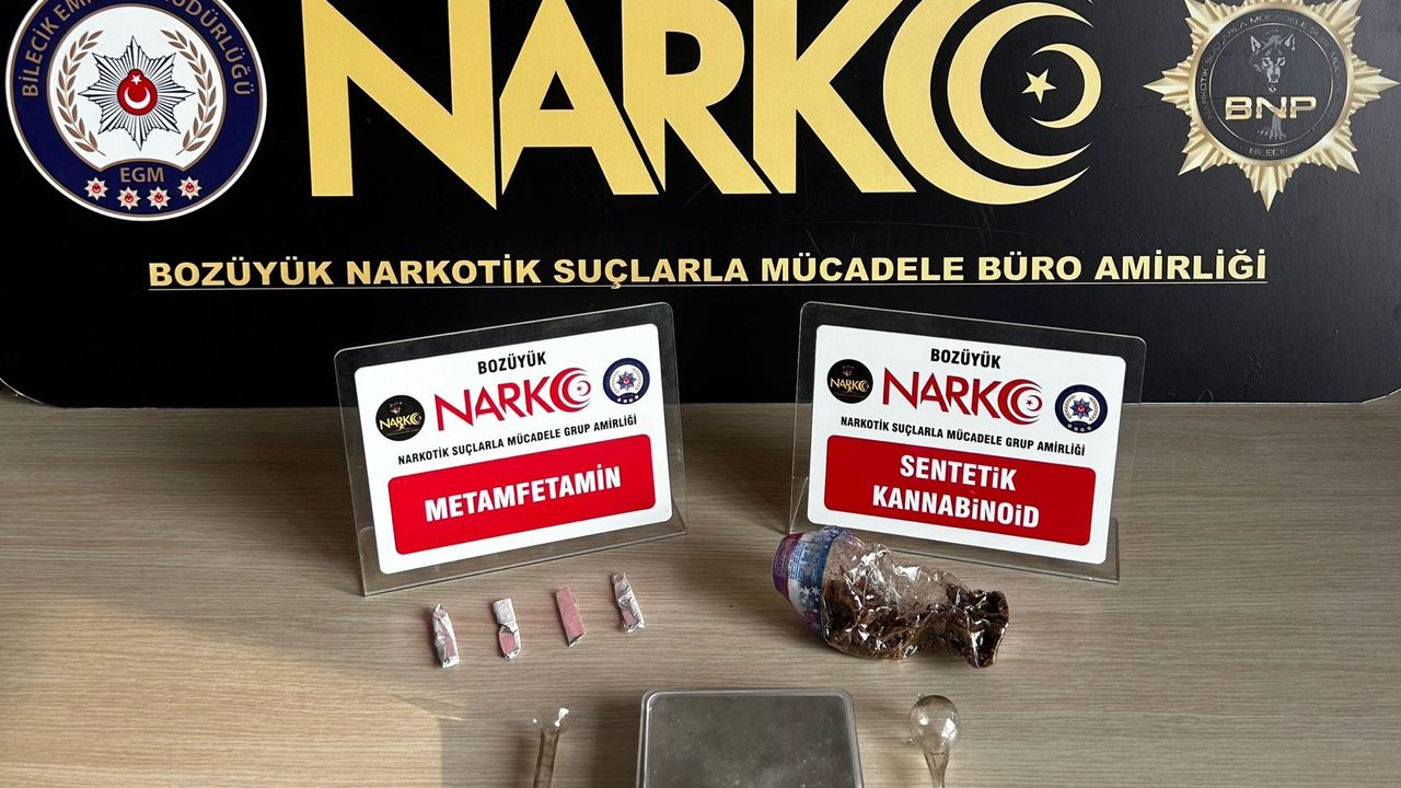 Bozüyük 'te Narkotik Suçlarla Mücadele Şube Müdürlüğünce Sokak satıcılarına yönelik olarak yürütülen çalışmalar kapsamında 3 adrese eş zamanlı uyuşturucu operasyonu düzenlendi. Düzenlenen operasyonda 18,84 gr sentetik kannabinoid (Bonzai) maddesi, 1,52 gr metamfetamin maddesi, 1 adet hassas terazi, 2 adet uyuşturucu madde tüketiminde kullanılan bong aparatı ele geçirildi. Gözaltına alınan üç şahıs hakkında 'Uyuşturucu Madde İmal Ve Ticareti' ve 'Kullanmak İçin Uyuşturucu Madde Satın Almak, Kabul Etmek Veya Bulundurmak' suçları kapsamında yasal işlem başlatıldı. Şahıslar ilk ifadelerinin ardından Bozüyük Cumhuriyet Başsavcılığına sevk edilirken, M.H. isimli şahıs adli kontrol şartıyla serbest, B.D, ve Ç. M. isimli şahıslar çıkarıldıkları Sulh Ceza Hâkimliğince Tutuklanarak Bilecik M Tipi Kapalı Cezaevine teslim edilmiştir.