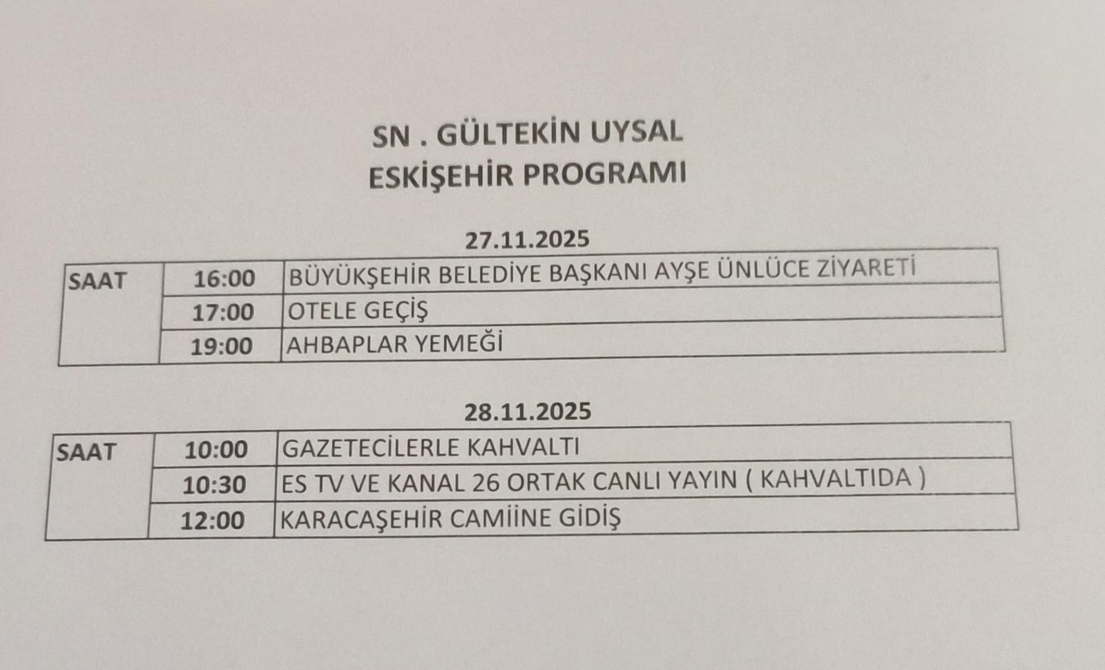 Konu ile ilgili edinilen bilgilere göre, Genel Başkan Gültekin Uysal, partililer tarafından karşılanacak. Demokrat Parti Lideri Uysal’ın ilk durağı Büyükşehir Belediyesi olacak. Uysal, Belediye Başkanı Ayşe Ünlüce’yi makamında ziyaret edecek. Genel Başkan Gületkin Uysal, bugün akşam Eskişehir AHBAPLAR Derneğinin davetlisi olarak düzenlenen yemeğe katılacak. Geceyi Eskişehir’de geçirecek olan Uysal,28 Kasım Cuma günü saat 10.00’da Eskişehir’deki basın mensuplarıyla bir araya gelecek. Uysal, aynı gün saat 12.00’de Karacaşehir Camiinde Cuma namazını kıldıktan sonra İstanbul’a gitmek üzere Eskişehir’den ayrılacak.