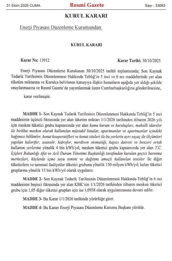 Resmî Gazete’de yayımlanan karara göre; asansör, hidrofor, otomat ve çevre aydınlatma gibi ortak alanlarda tüketilen elektrik için geçerli olan destek kademesi değiştirildi.