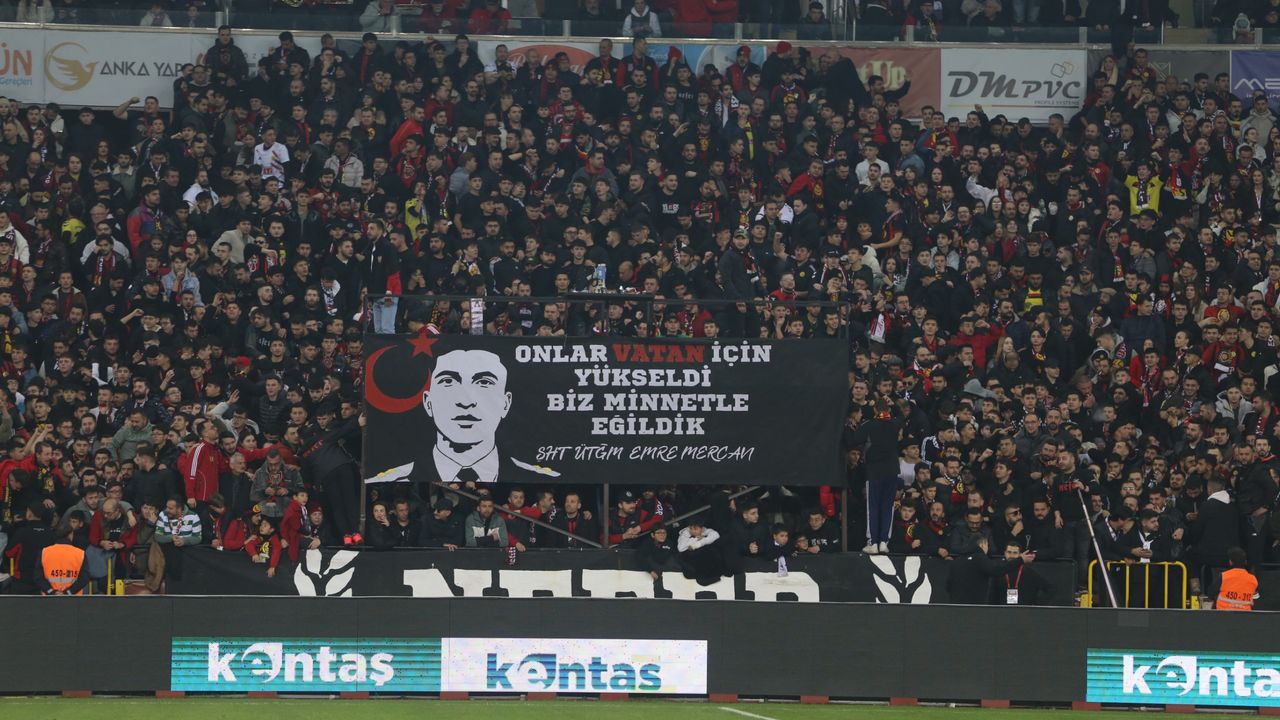 Eskişehirspor’un sahasında oynadığı Karşıyaka maçında taraftarlar, Gürcistan’da düşen askeri kargo uçağında şehit olan 27 yaşındaki Eskişehirli Hava Uçak Bakım Üsteğmen Emre Mercan için anlamlı bir pankart açtı. Tribünlerde yer alan pankartta, “Onlar vatan için yükseldi, biz minnetle eğildik” ifadeleri ve şehit Üsteğmen Mercan’ın fotoğrafı yer aldı.
