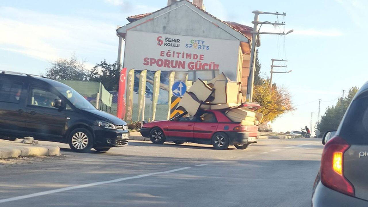 Bir otomobilin bagajına ve arka kısmına yüklenen koltuk takımının bazı parçalarının aracın üzerine kadar çıkarıldığı görüldü.