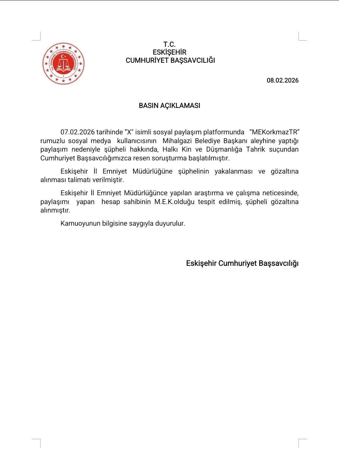 Eskişehir Cumhuriyet Başsavcılığından yapılan basın açıklamasına göre, 7 Şubat 2026 tarihinde "X" (eski adıyla Twitter) isimli sosyal medya platformunda "MEKorkmazTR" rumuzlu kullanıcının, Belediye Başkanı Zeynep Akgün’ün kılık kıyafetini ve dini değerlerini hedef alan paylaşımları üzerine resen soruşturma başlatıldı. Başsavcılık tarafından yapılan değerlendirmede, söz konusu paylaşımların "Halkı Kin ve Düşmanlığa Tahrik" suçunu oluşturduğu kanaatine varılarak, şüphelinin yakalanması ve gözaltına alınması için İl Emniyet Müdürlüğüne talimat verildi.