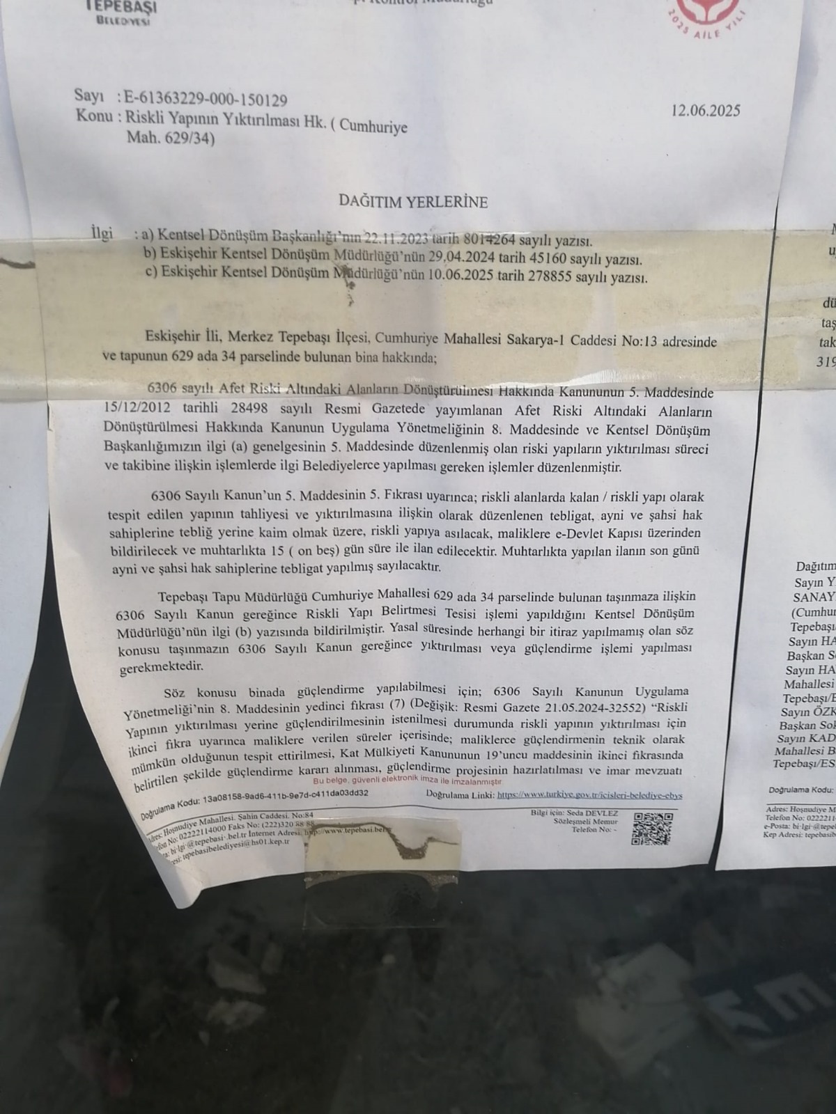 Geçtiğimiz haftadan itibaren Eskişehir genelinde etkili olan şiddetli fırtınanın ardından belediyelerin ilgili birimlerince yıkılması gerektiği halde olan birçok bina sahipleri için mahalle muhtarlıklarıyla işbirliğine giden yetkililer, boşaltılması acil olan binaların dış cephelerini “Riskli Yapı” şeklinde uyarı belgeleriyle donattı. Ağaçların bile devrilmesine sebebiyet veren yüksek katlı binaların etrafından geçmenin sakıncalı olduğunu belirten Eskişehirli vatandaşlarda, tehlikenin önlenmesi için biran öncede harekete geçilmesi çağrısı yaptı. Birçok kişide uzun süreden beri boşaltıldıktan sonra yıkılmasının yapılmadığı bina etraflarında da gerekli güvenlik önlemenin alınmasını istedi.