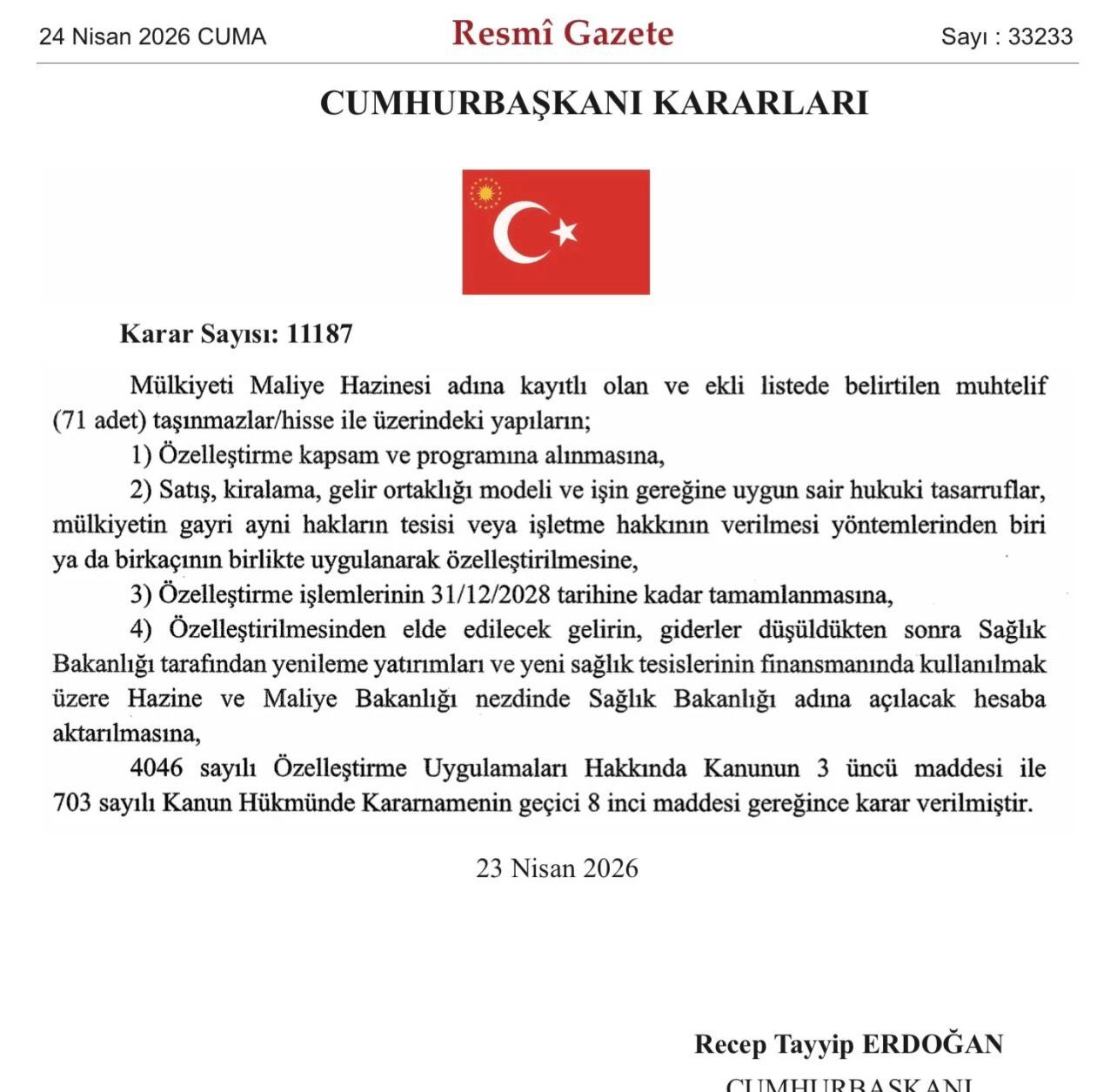 Taşınmazların satış, kiralama, gelir ortaklığı veya işletme hakkı devri gibi çeşitli yöntemlerle değerlendirileceği belirtildi. Özelleştirme sürecinin 2028 yılı sonuna kadar tamamlanmasının hedeflendiği ifade edildi.