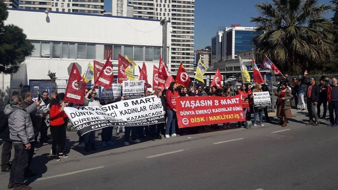 DİSK’e bağlı Nakliyat-İş Sendikası üyesi kadınlar çalıştıkları işyerleri önünde pankartlar açarak, artan şiddet ve cinayet olaylarını protesto etti. Kadın üyelerine destek veren Nakliyat-İş Sendika Şube Kadın Komisyon Başkanı Emel Selçuk “ Kadına yönelik her türlü şiddete son verilsin.8 Mart 1857’de New York’ta 40 bin dokuma işçisi, eşit işe eşit ücret, 8 saatlik iş günü, daha iyi çalışma koşulları ve insanca yaşayabilecekleri bir ücret talebiyle greve gitti. Grevin yapıldığı fabrikalardan birinde, işverenler işçileri fabrikaya kilitleyerek yangın çıkardı ve grevi sonlandırmaya çalıştı. Bu yangında 129 kadın işçi yaşamını yitirdi. Bu yiğit dokuma işçisi kadınların anısına, 8 Mart, Clara Zetkin’in önerisiyle Dünya Emekçi Kadınlar Günü olarak ilan edildi. Ancak 16 Aralık 1977’de Birleşmiş Milletlerin kararıyla “emekçi” kelimesi çıkartılarak günün adı 8 Mart Dünya Kadınlar Günü olarak değiştirildi. O tarihten bu yana birçok kurum ve kuruluş, 8 Mart’ı kadın mücadelesinden ve sınıfsal özünden kopararak sadece “Dünya Kadınlar Günü” olarak kutlamakta” dedi. Başkan Selçuk “ 8 Mart Dünya Kadınlar Günü değil, Dünya Emekçi Kadınlar Günüdür.8 Mart, tarihsel anlamıyla ezilen, sömürülen, baskıya boyun eğmeyen yiğit, onurlu ve mücadeleci emekçi kadınların günüdür” diye konuştu.