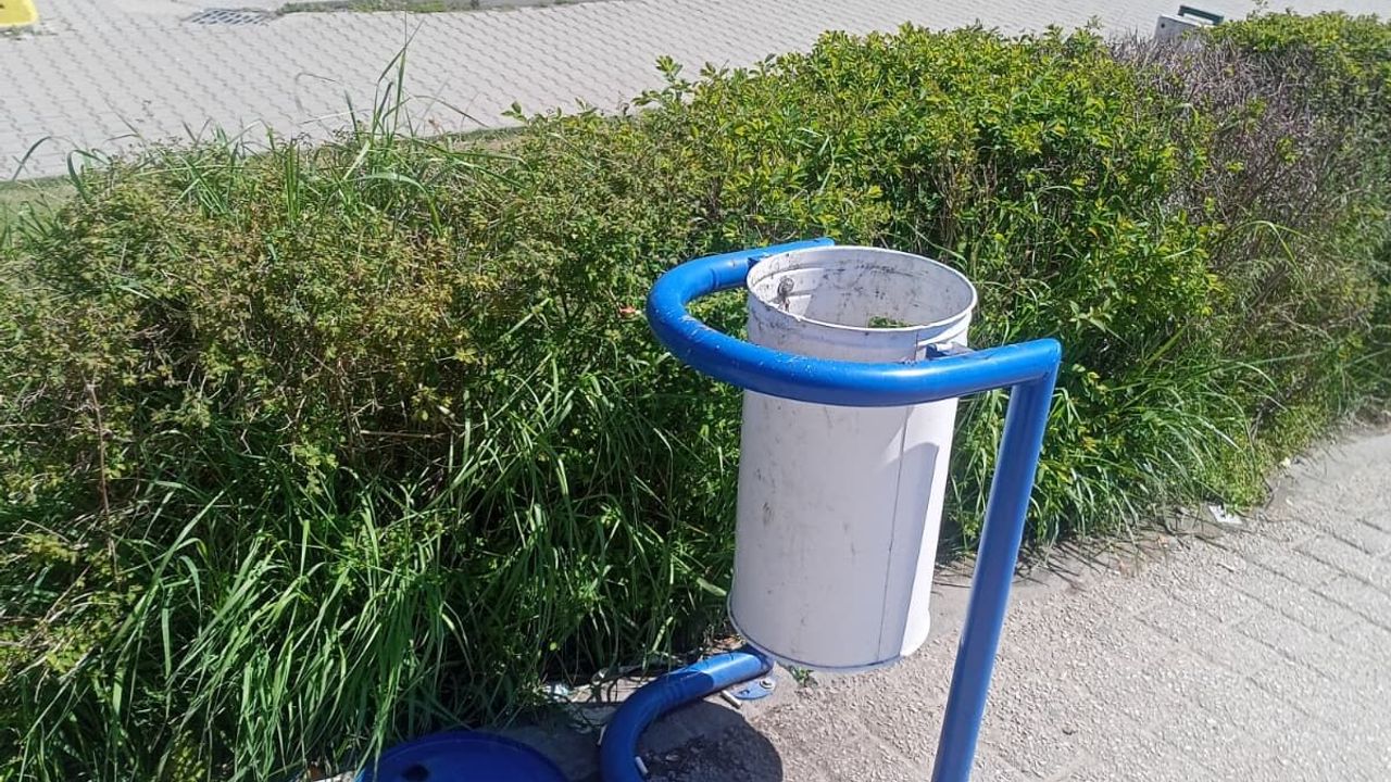 Çöp kutusunun kapağının yan tarafa bırakılması nedeniyle açık şekilde kullanıldığı, bu durumun hem görsel açıdan düzensizlik oluşturduğu hem de kullanım açısından eksiklik yarattığı dikkat çekti. Kapağın yerde bulunması, kutunun korunaksız kalmasına neden oldu.