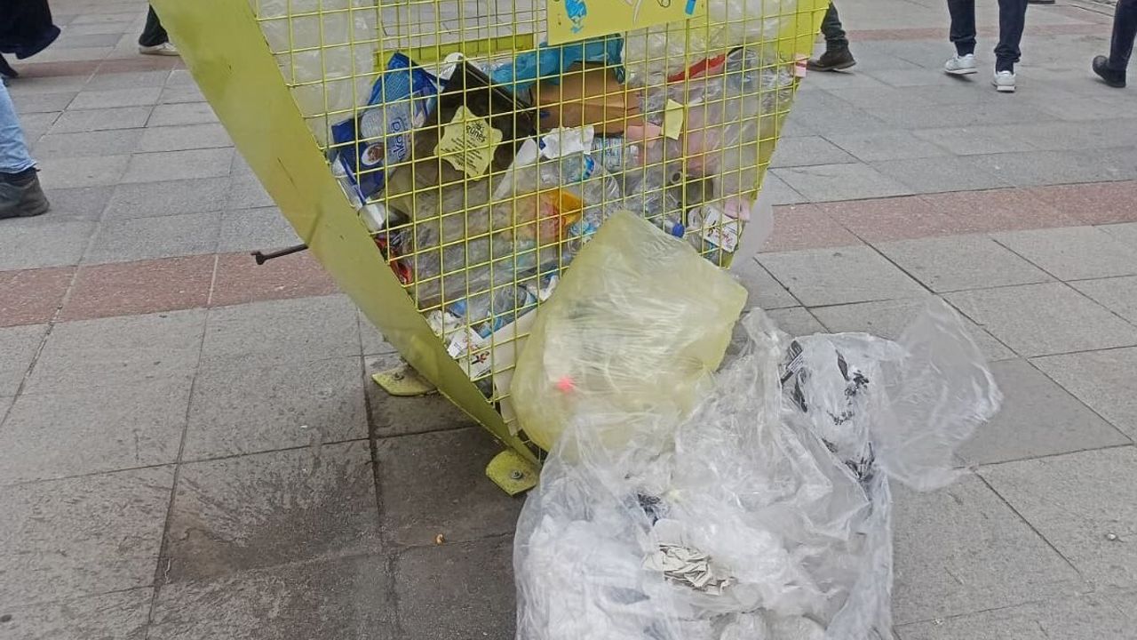 Eskişehir'de yaya trafiğinin yoğun olduğu noktada bulunan geri dönüşüm ünitesinin etrafında plastiklerin biriktiği ve zemine yayıldığı dikkat çekti. Toplama alanının dolu olmasına rağmen atıkların gelişigüzel bırakılması, çevre temizliği açısından olumsuz bir görüntü oluşturdu.