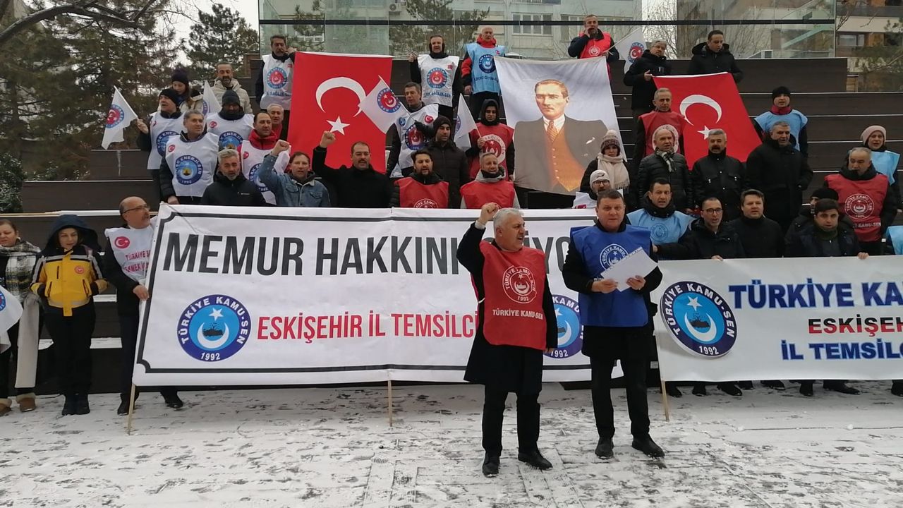 Çalışanlar dondurucu soğuğun altında taleplerini dile getirmek için sokağa döküldü. Türkiye Kamu-Sen Konfederasyonu tarafından alınan eş zamanlı eylem kararı Eskişehir’de Yediler Parkında gerçekleştirildi. Kamu-Sen Eskişehir Temsilciliği tarafından düzenlenen talep ve tepki eyleminde bayrak ve pankartlar açıldı. Konfederasyonu oluşturan sendika temsilci ve üyelerinin katıldığı eylem, saygı duruşu ve İstiklal Marşının okunmasıyla başladı.