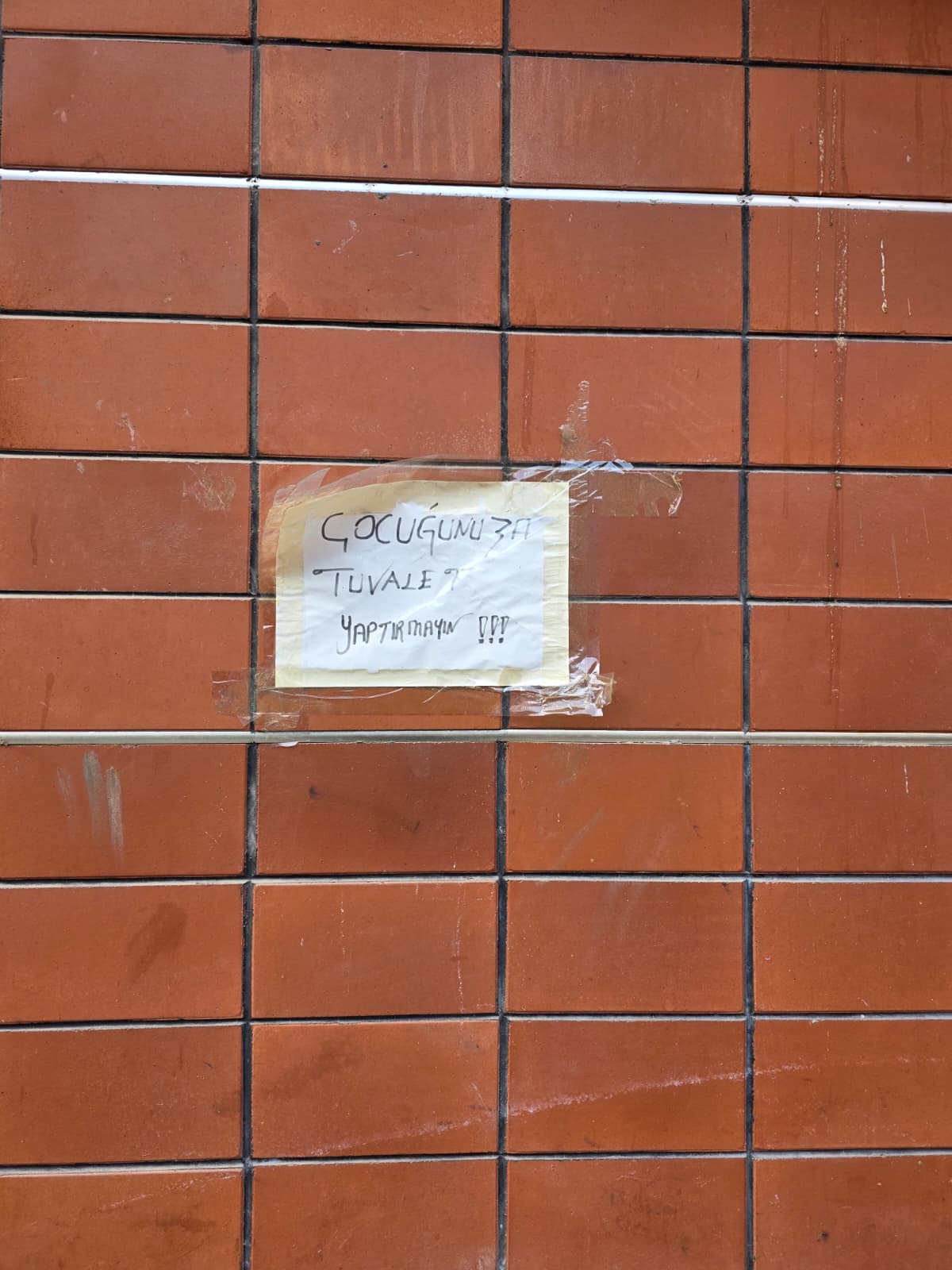 Kent merkezinde yaya trafiğinin yoğun olduğu Arifiye Mahallesi Cüce Sokak’ta, bir duvarın üzerine yapıştırılan kâğıtta “Çocuğunuza tuvalet yaptırmayın” ifadesi yer aldı. Notun, duvarın alt kısmında bulunan mazgalın hemen üzerine asılması dikkat çekti.