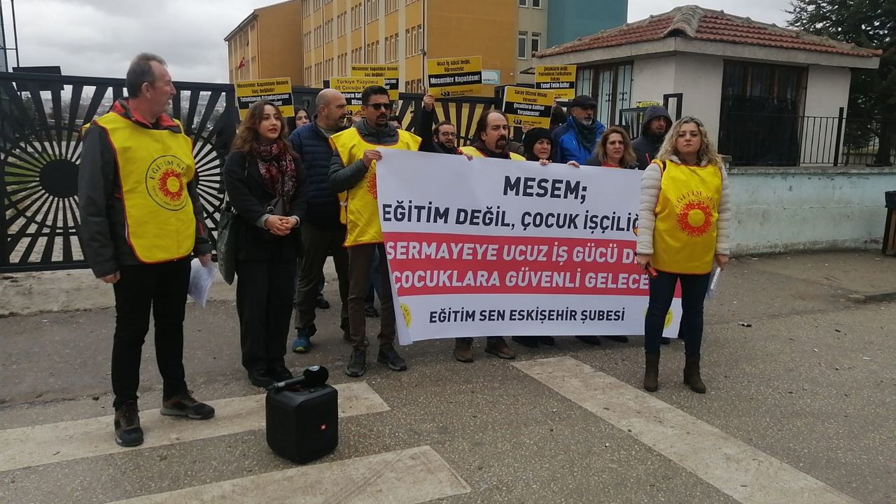MESEM uygulamasıyla çocukların eğitim hakkının gasp edildiğini ileri süren Kamu Emekçileri Sendikaları Konfederasyonu’na (KESK) bağlı Eğitim –Sen Sendika yönetici ve üyeleri Odunpazarı Merkezi Eğitim Merkez binası girişinde bir araya geldi.