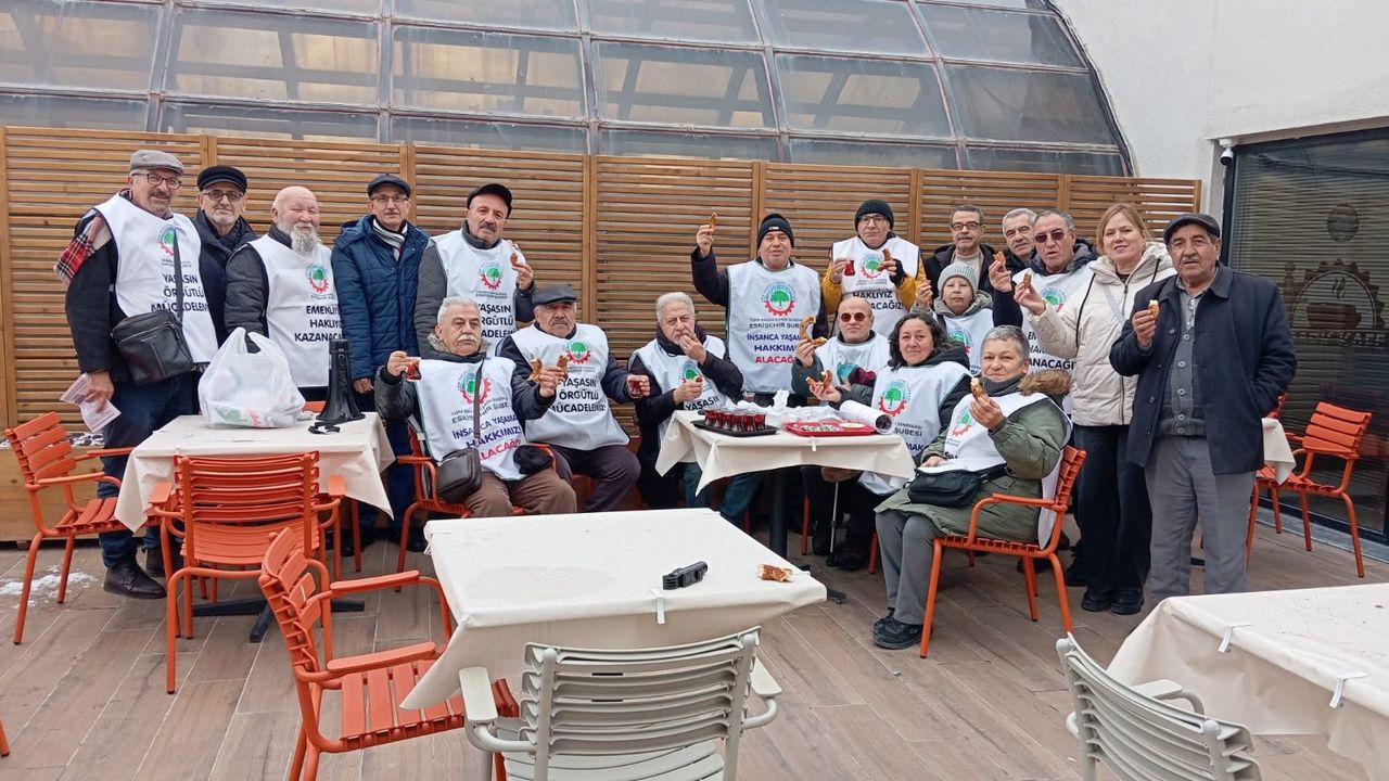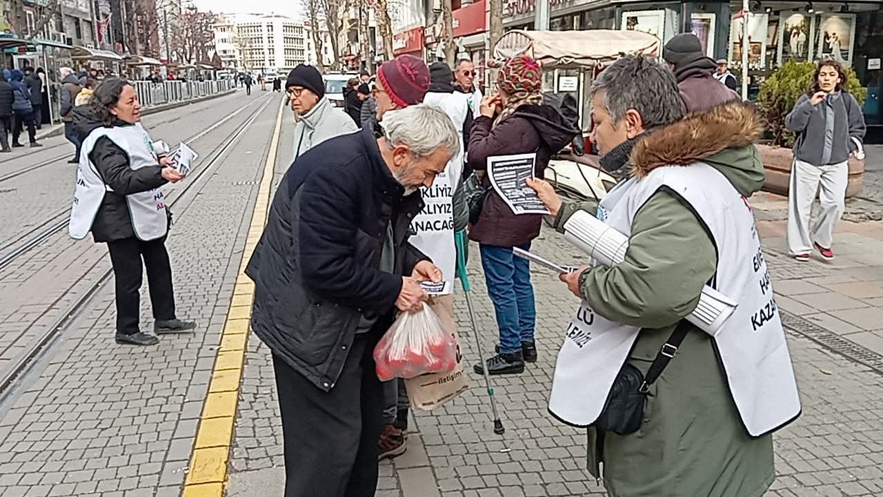Bir yılı daha hayal kırıklığı, geçim derdiyle mücadele etmekle geçirdiklerini dile getiren emekliler, parasızlıktan çay ve simit alarak karınlarını doyurmaya çalıştı. Dondurucu soğuk havanın altında yılmadan yıllardan beri sergiledikleri mücadeleden vazgeçmeyen emekliler, 2 Ocak Cuma günü gerçekleştirecekleri yürüyüş öncesi de Eskişehir halkına destek çağrısında bulundular. Sokaklara inen onlarca emekli 41 dakika boyunca taleplerini ve yaşadıkları sıkıntıları konu alan bin 570 adet bildirinin dağıtımını gerçekleştirdi. Yaşanan adaletsizliği asla kabul etmeyeceklerini belirten Tüm Emeklilerin Sendikası Eskişehir Şube Başkanı Ali Paşa Şanlı, emekliğe seyyanen 20 bin lira zam yapılması gerektiğini söyledi. Emekliler ve çalışanlar arasında yaşatılan ayrımcılığında biran önce sona ermesi gerektiğine de dikkat çeken Şube Başkanı Şanlı “En düşük emekli maaşı, en düşük memur maaşına endekslenmeli ardından yoksulluk sınırının üzerine çıkarılması için gerekli yasal düzenleme yapılmalıdır. Enflasyon kayıpları telafi edilmeli, refah payında eklenmelidir.3600 ek göstergesi tüm çalışanlara uygulanmalıdır. Emekli ve dar gelirli vatandaşlara kira ve barınma desteği mutlaka sağlanmalıdır. Bizler, dilenci değil, emekliyiz. Sadaka değil, bugüne kadar gasp edilen haklarımızın geri iade edilmesini istiyoruz.2 Ocak Cuma günü bu taleplerimizi yeniden Eskişehir sokaklarında haykıracağız” diye konuştu. Bildiri dağıtımının ardından emekli vatandaşlar çay ve simitle emeklinin düştüğü durumu gösterdi.