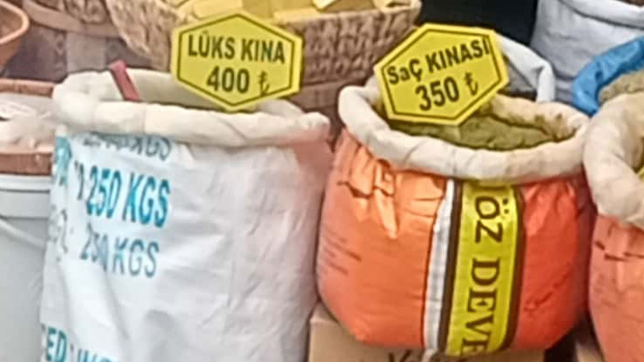 Büyük torbalar içinde sergilenen ürünler arasında “lüks kına” ve “saç kınası” da yer aldı.
