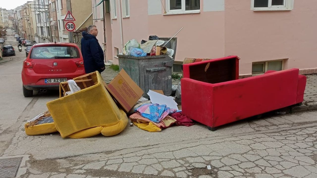 Eskişehir Şirintepe Mahallesi’nde çöp konteyneri çevresine gelişigüzel bırakılan eski koltuk, sünger ve karton kutular sokak ve kaldırımda düzensiz bir görüntü oluşturdu. Yetkililer, atıkların kaldırılmasıyla alanın yeniden düzenleneceğini belirtiyor.