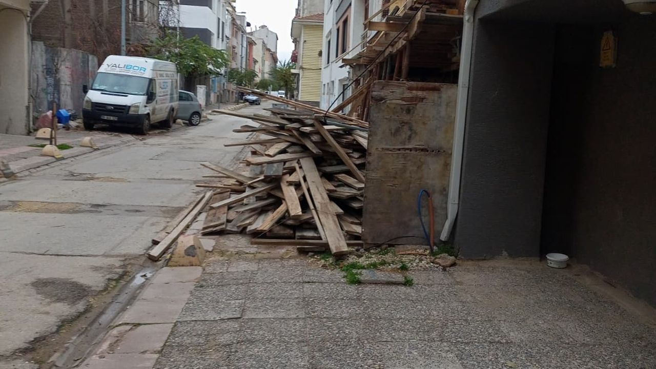 Eskişehir'de binanın dış cephesinde devam eden çalışmalar nedeniyle yığılan tahta ve kalıp parçalarının kaldırım boyunca uzandığı, malzeme yığınının zamanla yola doğru taştığı görüldü.