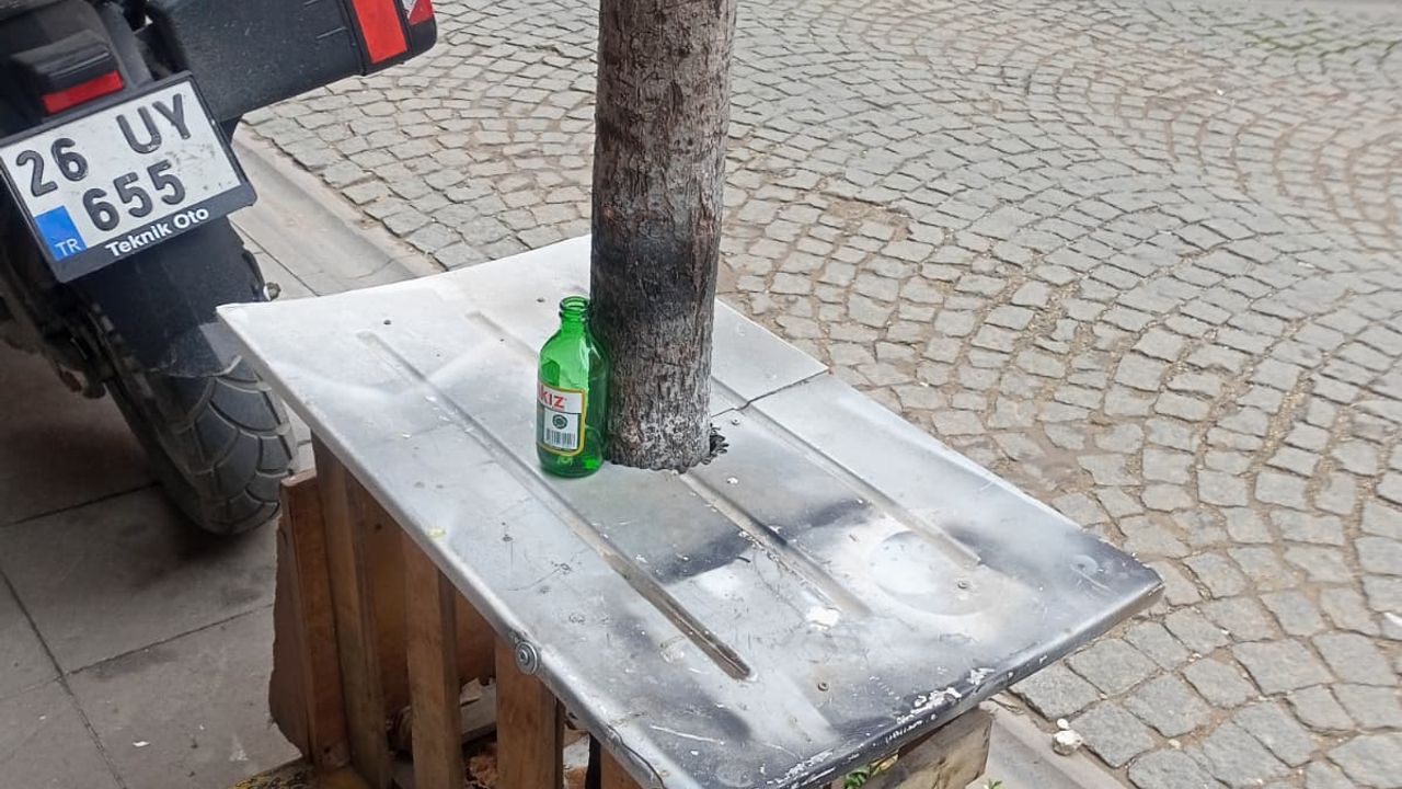 Sokağı hareketlendiren küçük işletmelerin bulunduğu bölgede, bu tür bireysel çözümler sıkça karşımıza çıkarken düzenin korunması çoğu zaman güçleşiyor. Ağacın çevresinde biriken çöpler ve metal yüzeyde bırakılan içecek şişeleri, sokak estetiğinin bozulmasına neden oluyor. Gün içinde yoğun yaya hareketliliğinin yaşandığı sokakta, bu görüntü çevredeki esnafların da dikkatinden kaçmıyor.