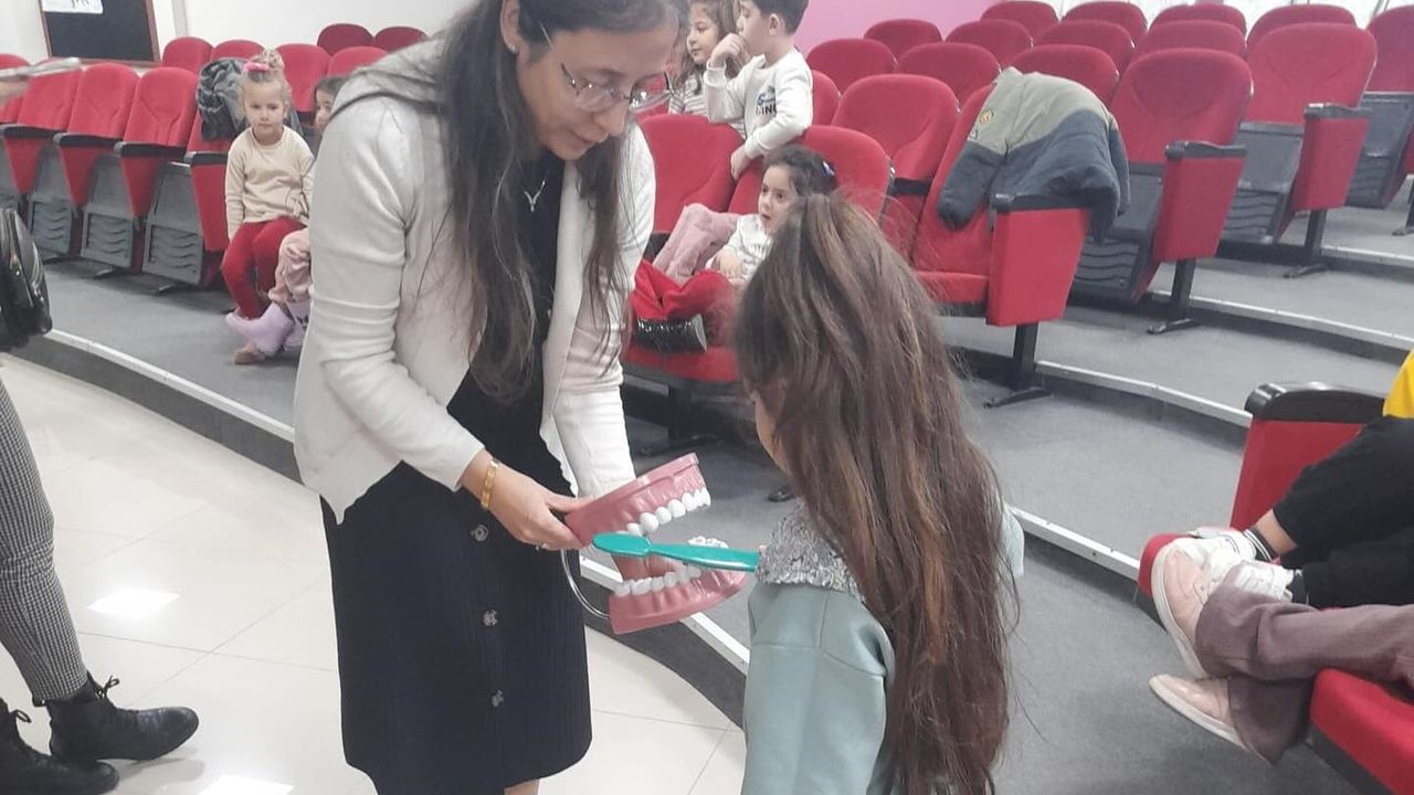 Küçük öğrenciler, Eskişehir Ağız ve Diş Sağlığı Hastanesini ziyaret ederek diş sağlığı konusunda görevliler tarafından bilgilendirildiler.17-23 Kasım Toplum Ağız ve Diş Sağlığı Haftası dolayısıyla Öğretmen Esra Akkaya Anaokulu öğrencileri, sınıf öğretmenleri gözetiminde Ağız ve Diş Sağlığı Hastanesini Ziyaret etti. Hastane görevlileri tarafından karşılanan küçük öğrenciler, çeşitli birimleri gezerek bilgi aldı. Ağız ve Diş Sağlığı Hastanesi yetkilileri, öğrencilere diş sağlığı, bakımı, çocuklarda sık görülen diş hastalıkları, diş korunması gibi konularda bilgi verildi. Uygulamalı diş sağlığı eğitimine katılan öğrenciler görevlileri sorun yağmuruna tuttu. Sınıf öğretmenleri, öğrencileri konuk eden hastane yetkililerine teşekkür ederek ziyareti sonlandırdı.