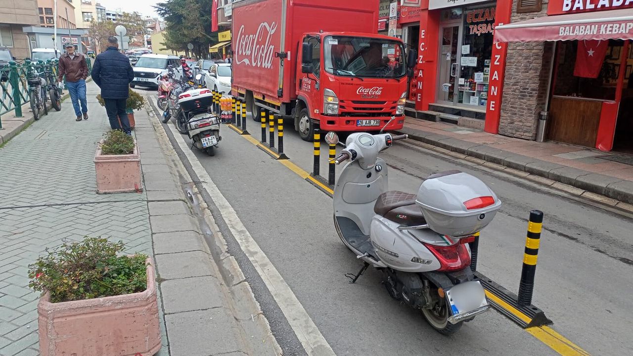 Eskişehir Büyükşehir Belediyesi’nin arka tarafında, park yapılmasını önlemek amacıyla yerleştirilen dubalara rağmen motosikletlerin bu alana park ettiği görüldü. Yolun ortasında konumlandırılan dubaların arasına bırakılan motosikletler, düzenlemeye rağmen ihlalin sürdüğünü ortaya koydu.