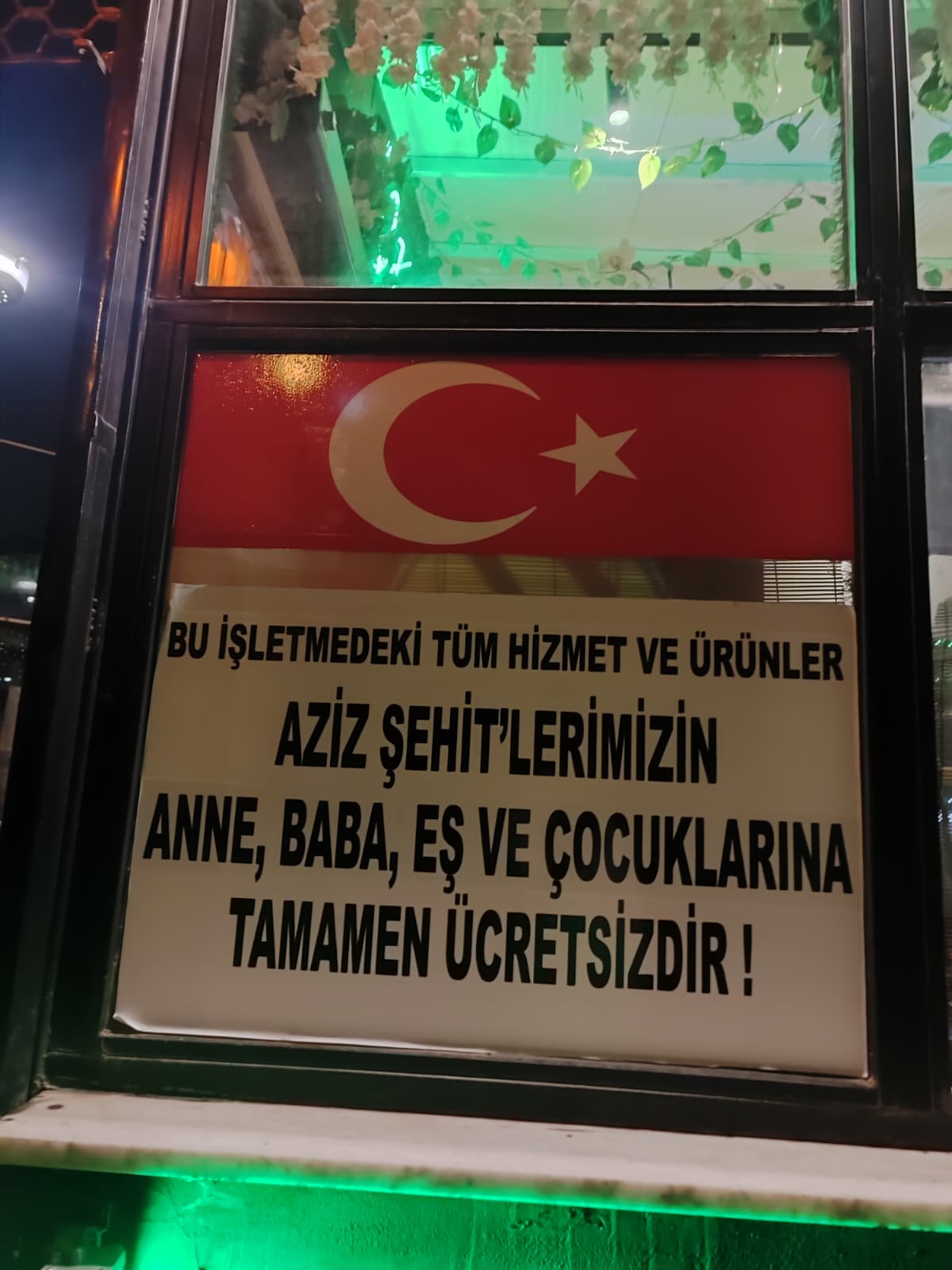 Eti Caddesi üzerinde faaliyet gösteren bir kafe işletmesi, anlamlı bir uygulamaya imza attı. İş yerinin camına asılan “Bu işletmedeki tüm hizmet ve ürünler, aziz şehitlerimizin anne, baba, eş ve çocuklarına tamamen ücretsizdir” yazısı, vatandaşların takdirini topladı. İşletme yetkilileri, bu uygulamayı şehitlerin aziz hatırasına duydukları saygının bir göstergesi olarak hayata geçirdiklerini belirtti.