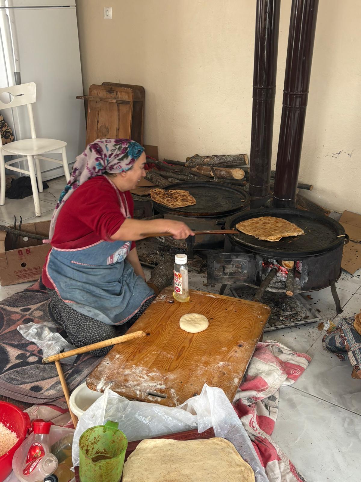 Han’da bulunan kadınların oluşturduğu kadın kooperatifinde çalışan Sevilay Kırmazer, bize yaptıklarından bahsediyor: “30 yıl oldu Han’a geleli. 3 çocuk annesiyim. İkisini evlendirdim, biri okuyor. Ona destek olmak için kadın kooperatifinde çalışıyorum. Burayı sadece kendimiz 12 kişi kurduk. Perşembe günleri gözleme yapıyoruz. Yaz aylarında eriştelerimiz var, bulgur kaynatıyoruz. Nohut satıyoruz, erişte kesip satıyoruz. Lavanta yağından sabun yapıyoruz. Ev ekonomisine katkı sağlıyoruz. Satışlarımıza Allah bereket versin, iyi şimdilik. Memnunum. Burada ben şimdi haşhaşlı Han gözlemesi, patatesli, ıspanaklı yapıyorum. Çoğu yerde katmer olarak geçiyor da burada haşhaşlı gözleme diyoruz biz. Odun ateşinde yapıyoruz. Haşhaşı taş değirmende çekilmiş alıyoruz. Farkı o, farkı sevgimiz…