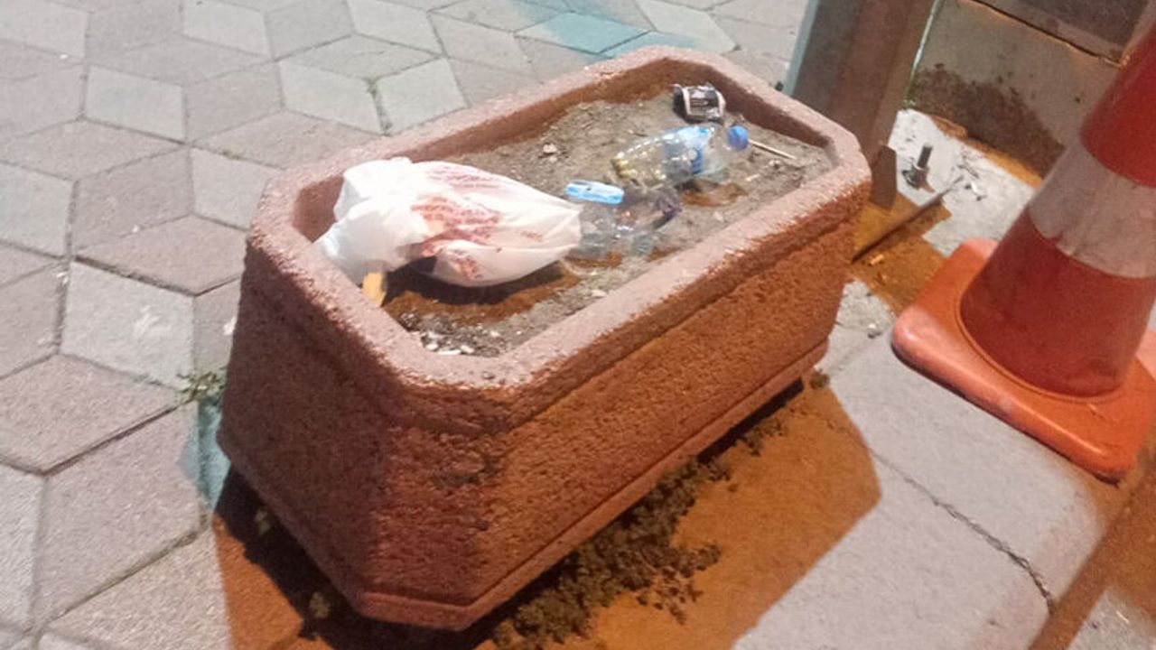 İçinde bitki bulunmayan saksının plastik atıklar ve çöplerle doldurulduğu görüldü.