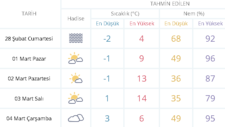 Sıcaklıkların genel olarak eksi 2 dereceye kadar düşmesi bekleniyor. İlçeler bazında değerlendirildiğinde, Mihalıççık’ta sıcaklık eksi 2 derece civarında seyrederken, Beylikova’da eksi 1 dereceye kadar düşebilir. Rüzgârların kuzey ve kuzeybatı yönlerinden hafif esmesi bekleniyor. Şu anda herhangi bir meteorolojik uyarı bulunmuyor. Genel olarak 28 Şubat günü Eskişehir’de soğuk, bulutlu ve yer yer kar yağışlı bir hava hâkim olacak.