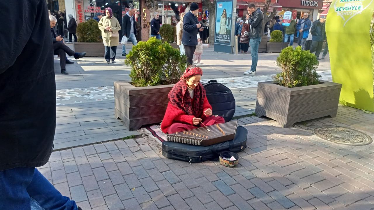 Caddenin orta bölümünde yere serdiği örtü üzerine oturan bir sokak sanatçısı, elindeki vurmalı telli enstrümanla melodiler çalarak çevredeki vatandaşların dikkatini çekti.