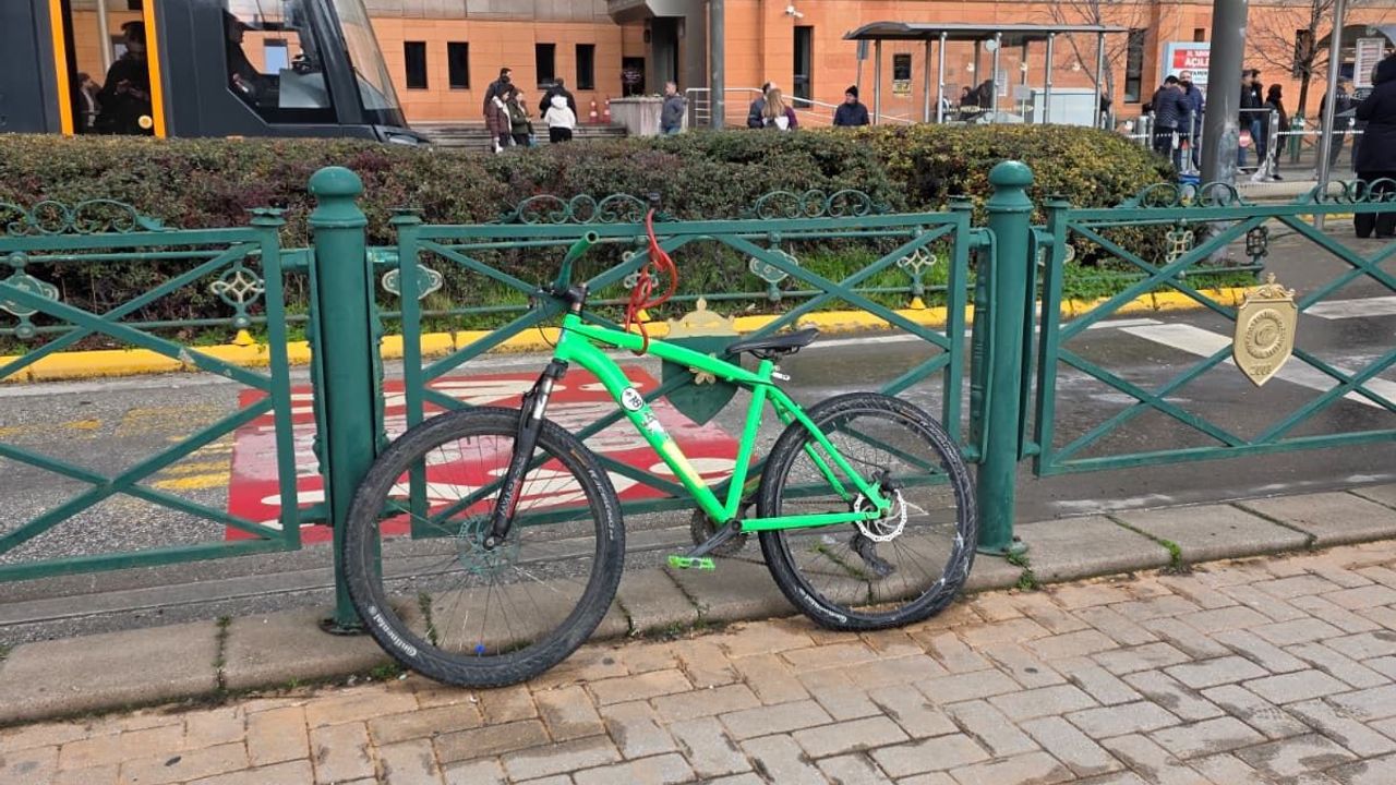 Eskişehir’in en yoğun geçiş güzergâhlarından biri olan Vilayet Meydanı’nda ilginç bir görüntü dikkat çekiyor. Tramvay durağının hemen yanında bulunan yeşil korkuluklara kırmızı kilitle sabitlenen parlak yeşil renkli dağ bisikleti, uzun süredir aynı noktada duruyor. Gün içerisinde binlerce kişinin kullandığı alanda yer alan bisikletin aylardır yerinden hareket ettirilmediği belirtiliyor.