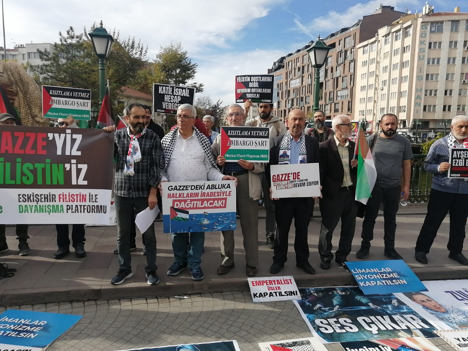İsrail Eskişehir’in göbeğinde açılan pankartlar, atılan sloganlar eşliğinde protesto edilirken, Filistin halkına da destek yağdı. Eskişehir Filistin Kardeşlik Platformu üyeleri hafta sonu Köprübaşı mevkiinde bir araya gelerek, İsrail’i protesto eden bir gösteri gerçekleştirdi. Kadınlarında katıldığı eyleme bölgeden geçmekte olan vatandaşlarda alkışlayarak bazıları da aralarına katılarak destek verdi. Eskişehir-Filistin Kardeşlik Platformu Adına Söz alan Uygar Kurtçu, Filistin halkının yalnız olmadığını belirterek İsrail ve işbirlikçilerine tepki gösterdi. “Kahrolsun İsrail, Yaşasın Filistin” sloganlarıyla sık, sık sözleri kesilen Kurtçu “7 Ekim 2023 tarihinden itibaren iki yıl, 10 Ekim 2025 ateşkes anlaşmasından itibaren 16 gün geçti. 2 yıldır süren soykırımda yüz binin üzerinde insan hayatını kaybetti. 10 Ekim ‘de, yani bundan 16 gün önce, direnişin olmadığı masada imzalanan ateşkes anlaşmasından itibaren ise yüzün üzerinde sivil hayatını kaybetti.Onlarca ülkenin devlet başkanının hazır bulunduğu ancak Filistin halk temsilcilerinin ve direniş örgütlerinin olmadığı imza töreninde ateşkesin garantörlerinden biri de yaşadığımız ülke, Türkiye Cumhuriyeti olarak ilan edildi. Bu süreçte Hamas’a baskı yapma misyonunu üstlenen AKP iktidarı, Siyonist rejim tarafından yüzün üzerinde gerçekleşen ateşkes ihlali ve ateşkese rağmen İsrail saldırılarında hayatını kaybeden onlarca Gazzeliye rağmen sesini çıkartmamıştır. Anlaşmanın garantörlerinden olan Türkiye Cumhuriyeti Devletini ve AKP iktidarını acilen hamaseti bırakıp harekete geçmeye davet ediyoruz” dedi.