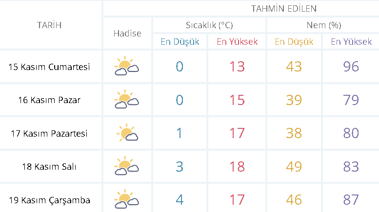 Gün boyu sıcaklıkların mevsim normalleri civarında seyredeceği öngörülüyor. Sabah saatlerinde şehir merkezinde sıcaklıklar 3°C civarında başlarken, öğleye doğru 12°C, öğleden sonra ise 17°C’ye kadar yükselecek. Akşam saatlerinde ise sıcaklıkların yeniden düşerek gece 8–10°C aralığına inmesi bekleniyor. Rüzgarların kuzey ve batı yönlerinden hafif, zaman zaman orta kuvvette eseceği öngörülüyor. Gün boyunca yağış beklenmiyor; bu nedenle öğle ve ikindi saatlerinde dışarıda vakit geçirmek için uygun bir hava şartları bulunuyor.