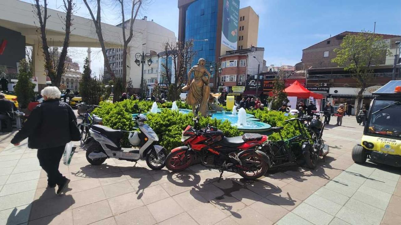 Eskişehir’in en yoğun noktalarından biri olan Taşbaşı Çarşısı önündeki süs havuzu çevresine park edilen motosikletler, görüntü kirliliğine neden oldu.
