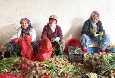 Mihalgazi'de kadınlar, tarımsal üretimin vazgeçilmez gücü… Taze soğan demetleyen kadınların yanına uğruyoruz. Burada Ayşe Kahya, bizlere neler yaptıklarını anlatıyor: “İşçilerin başındayım, ekipleri topluyorum ve işe getiriyorum. Kışın burada, yazın ise Eskişehir’de çalışıyoruz. Soğanları demet yapıyoruz. Ispanak, roka olursa onları da yapıyoruz. Patronumuz hangi işi verirse onu yapıyoruz. Serada çalışma süresi günde yaklaşık 9 saat. Biz alışığız. Senelerdir bu işin içindeyiz. Bir işçi günde ortalama 40–50 kilo ürün demetliyor. Serada çalışan ekip sayısı ise sezona göre değişiyor. Bazen 12-13 kişiye düşüyor ama ortalama 15 işçimiz var. Soğan sezonunun bayrama kadar sürecek. Sonrasında ekip yeniden Eskişehir’e dönecek. Yaz döneminde serada domates ve biber üretimine geçiliyor ve farklı işçiler çalışıyor.”