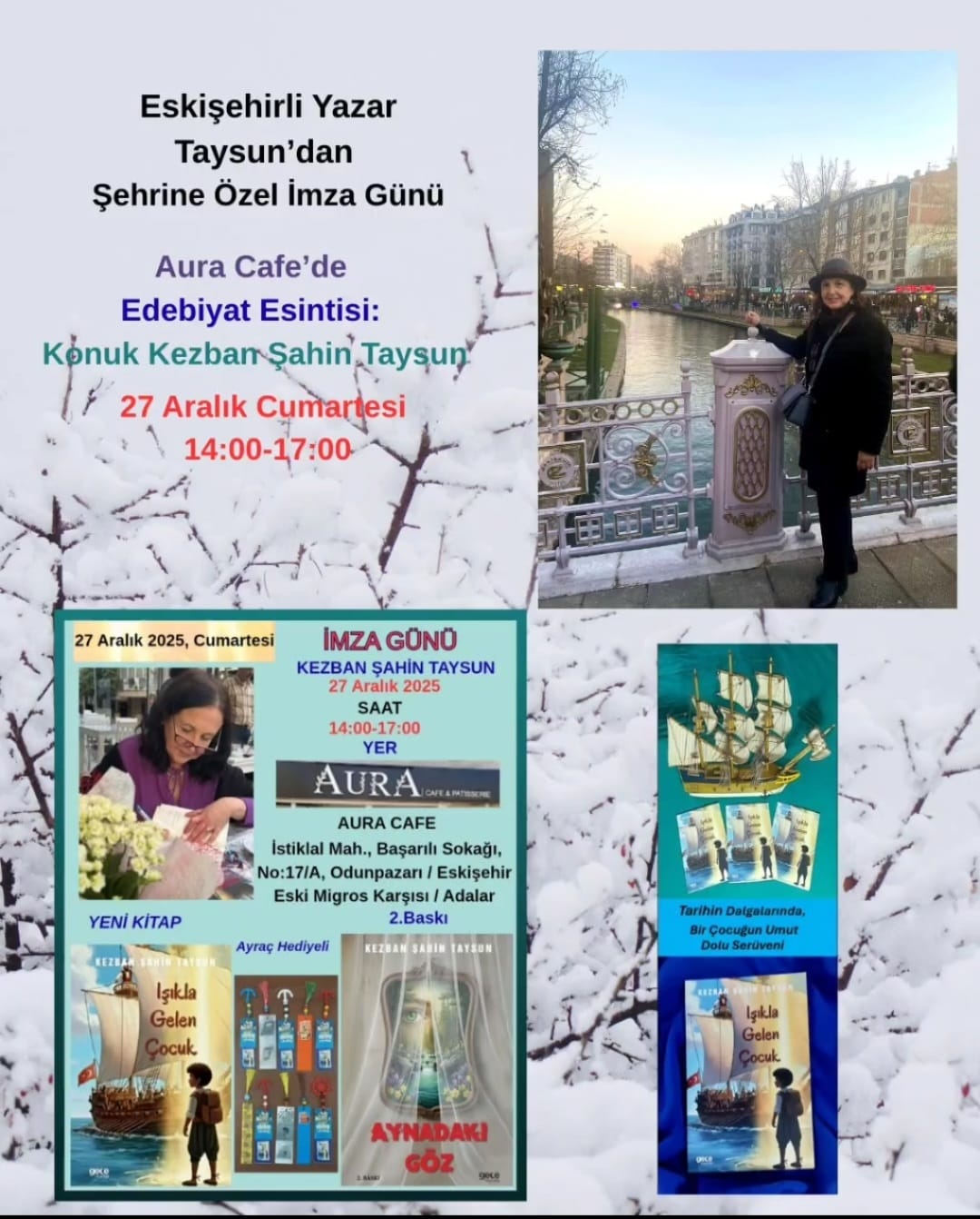 Aura Cafe’de gerçekleştirilecek “Edebiyat Esintisi” başlıklı imza gününde, yazar Kezban Şahin Taysun edebiyatseverlerle bir araya gelecek. Etkinlik, 14.00 ile 17.00 saatleri arasında yapılacak.