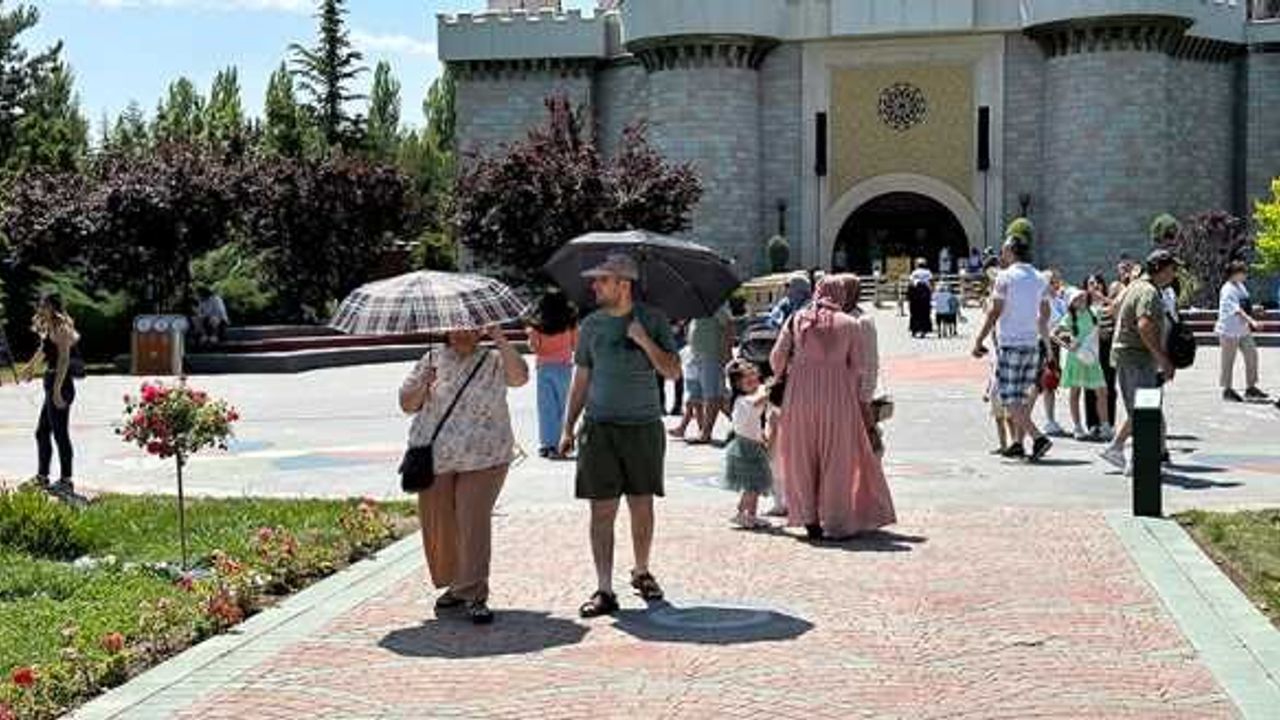Yüksek sıcaklık sebebiyle bunalan vatandaşlar, güneşin zararlı ışınlarından korunabilmek için şemsiye kullandı.