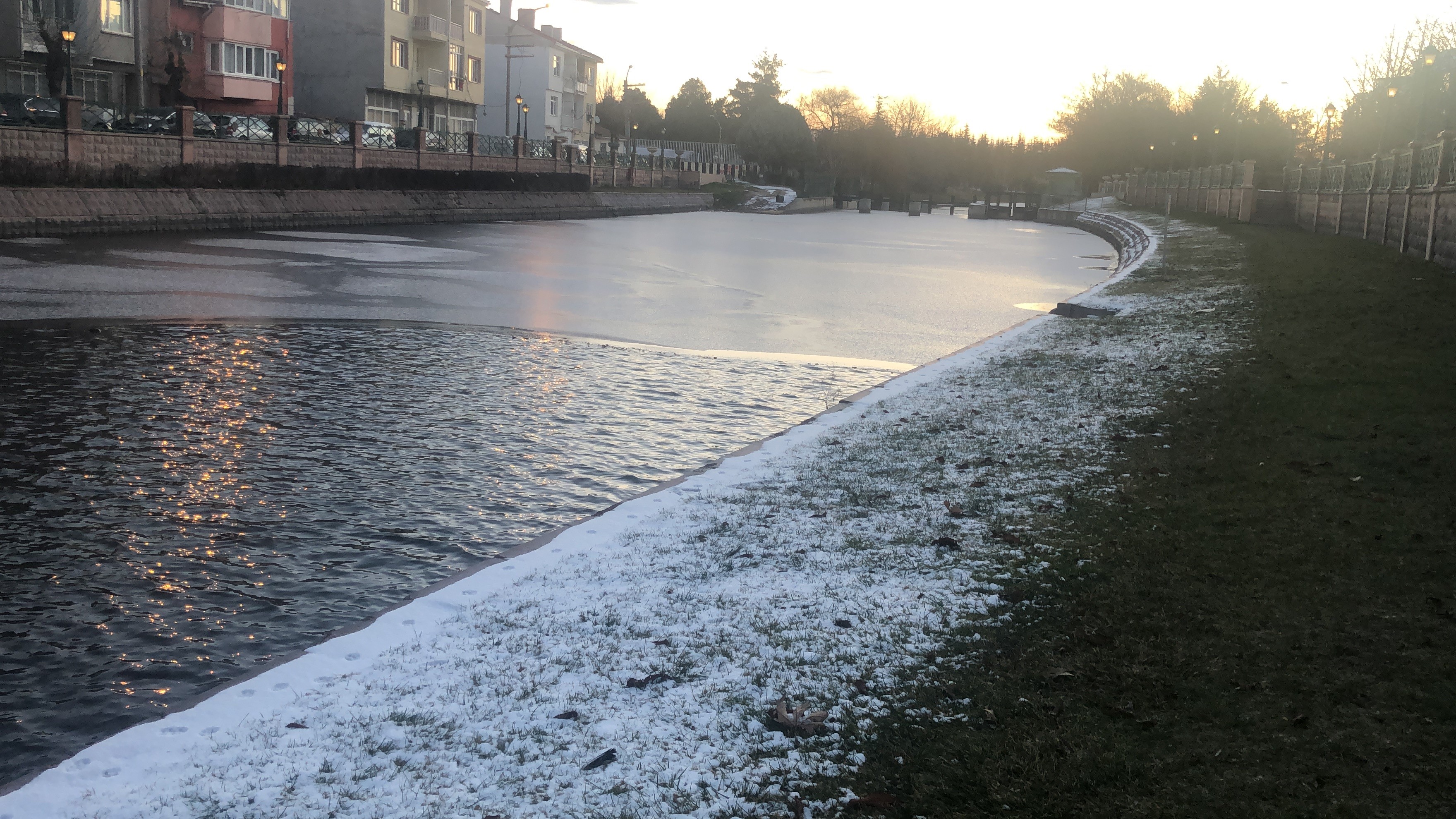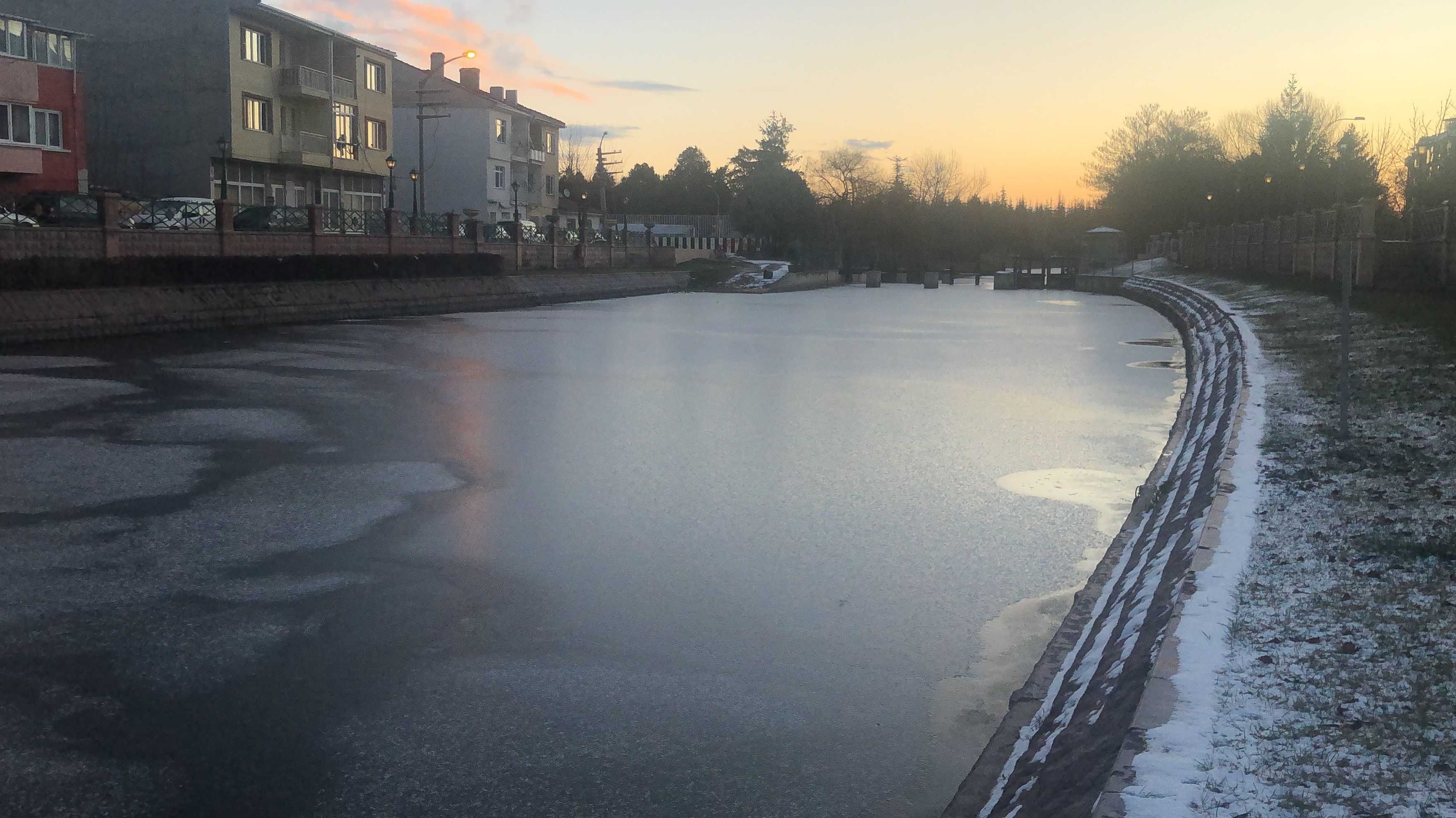 Gece saatlerinden itibaren hava sıcaklığının sıfırın altına düşmesiyle birlikte çayın yüzeyinde geniş bir buz tabakası oluştu.