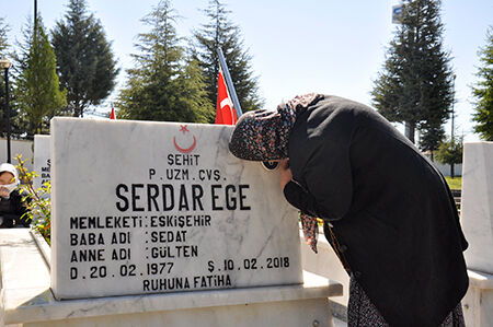 2018 yılında Afrin’de Zeytin Dalı Harekâtı şehit düşen P. Uzm. Çvş. Serdar Ege’nin annesi Gülten Ege, duygu dolu anlar yaşadığı şehitlik ziyaretinde, “Gelen Allah’tan o yüzden hiçbir şey diyemiyoruz. 2018 yılında Afrin’de şehit düşmüştü.