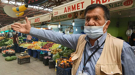 ...“Portakallar, erikler, çilekler, bunların hepsi olduğu gibi toz. Yani bunu hiç mi görmüyor belediye yetkilileri hiç mi bakmıyorlar? Esnaflık bu kadar hakir mi? Biz yetkilileri arıyoruz kaç gündür gelip ilgilenen yok. Adamlar kafasına göre yıkım yapıyorlar sulama gibi bir önlem, bir tedbir yok. İki tane plastik çekilmiş, ‘buradan geçmek yasak’ diyorlar. Böyle şey olur mu? Güzelce önlemini al barikatla, tankerle sulayarak yıkımını yap. Kusura bakmayın pazarcı olarak şu sebzelerin ve meyvelerin durumuna bakar mısınız? Komple toz içinde her yer. Pazarın içi, apartmanlar ve evler de toz içinde” diyerek tepki gösterdi.
