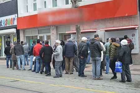Yapılan gözlemlerde şehir merkezinde bulunan hemen hemen her banka şubeleri ve ATM’lar önünde oluşan uzun kuyruk, kaldırımlardan taştı.
