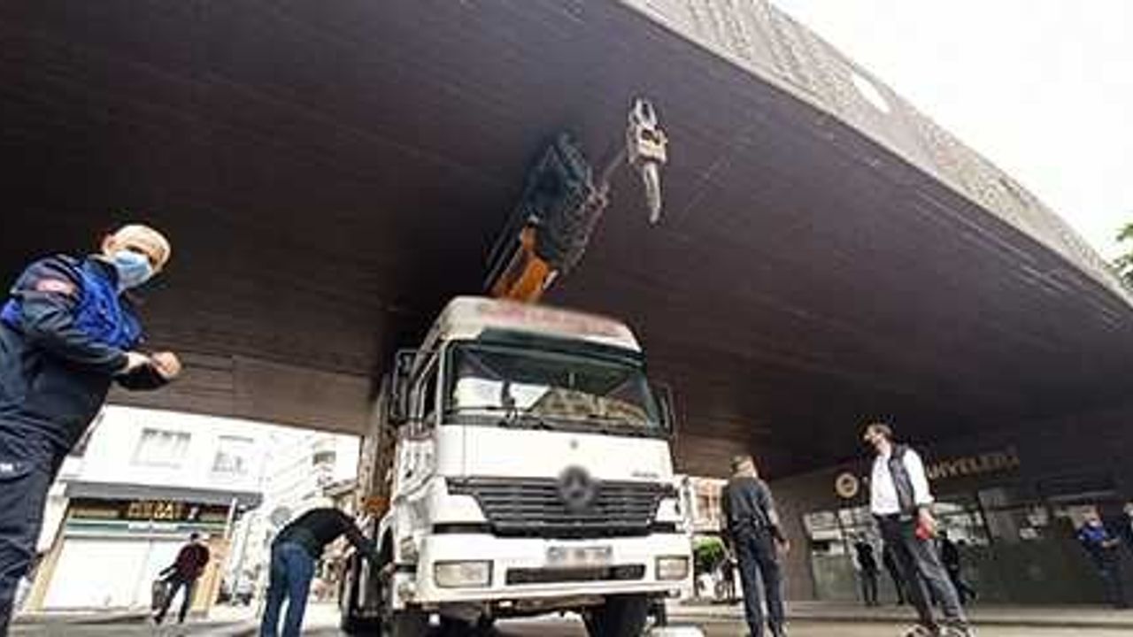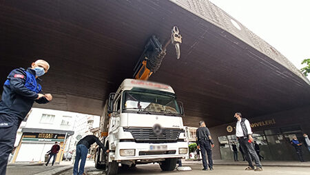 yüksekliği nedeniyle köprünün altından geçemedi. Kısa sürede vatandaşların merak edip geldiği kamyonun çevresi kalabalıklaştı