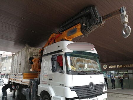 Bir lojistik firmaya ait olan kamyonun üst kısmında bulunan kanca kısmı,