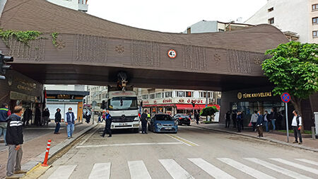 Hamamyolu Caddesi’ni birbirine bağlayan ve İbrahim Karaoğlanoğlu Caddesi üzerinde yer alan Hamamyolu Sanat Köprüsü altında sıkışan kamyon, bir süre köprünün altında bekletildi.