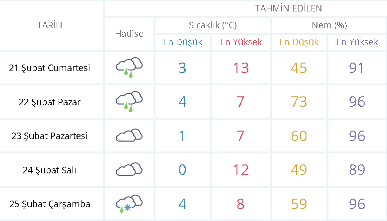 Rüzgarın güney ve güneybatı yönlerinden hafif ve zaman zaman orta kuvvette eseceği öngörülüyor. Hafta içi karla karışık yağmurun etkili olduğu Eskişehir’de, hafta sonunda ise kar yağışı bekleniyor. Özellikle pazar günü hava sıcaklığı 10 derecenin altına düşecek. Ancak genel olarak hava kapalı olacak. Meteoroloji yetkilileri vatandaşların hava değişimlerine karşı tedbirli olmasını önerdi.