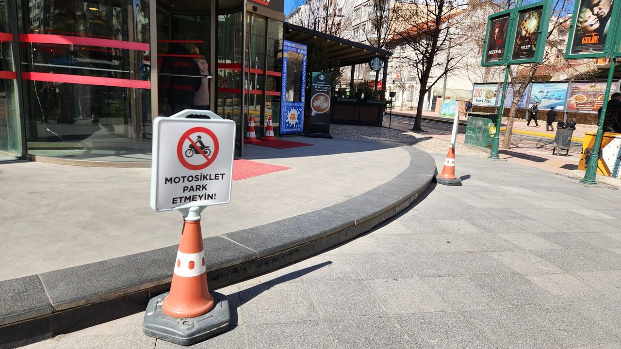 İşletmelerin girişlerine ve yaya geçiş alanlarına bırakılan motosikletler nedeniyle bazı esnaflar çözümü “Motosiklet park etmeyin” yazılı dubalar yerleştirmekte buldu.
