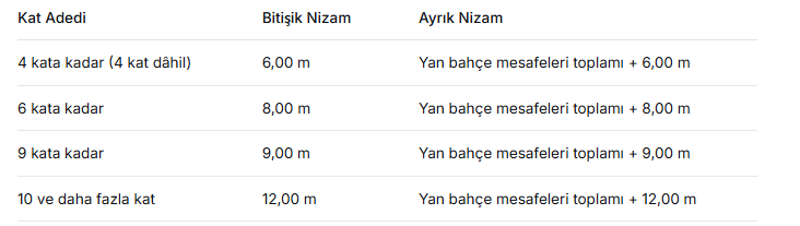 4 kattan fazla binalarda her ilave kat için yan ve arka bahçe mesafelerine 0,50 metre ekleniyor