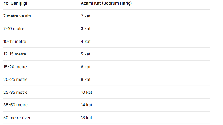 İmar planında kat adedi belirtilmemiş parsellerde yol genişliğine göre azami kat adedi şöyle belirlendi: