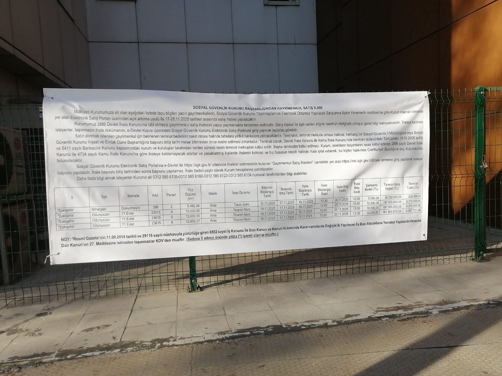 Konu ile ilgili edinilen bilgilere göre, Odunpazarı meydanında yer alan Sosyal Sigortalar Kurumu İl Müdürlüğü önüne dev bir pankart asılarak satılacak olan gayrimenkulle mevkilerini, başvuru şartlarını, ilçe ve mahalle isimlerini, ada, parsel, yüzölçümü ve tarihlerinin yer aldığı bir pankartı asarak yatırım yapmak isteyenlere çağrıda bulundu. Sosyal Güvenlik Kurumuna ait taşınmazların elektronik ortamdan yapılacak ihalelerle satışa çıkarıldığı belirtildi. Kuruma ait olan Mihalgazi İlçesi Dokuz Mayıs Mahallesinde 5 bin 482,38 metrekare, Odunpazarı İlçesi 71 Evler Mahallesinde 15 bin metrekare, yine 71 Evler Mahallesinde 15 bin metre kare aynı mahallede 12 bin 956,37 metre karelik 4 arsasını satacak. arım ve Ticaret alanı olan arsalara başvurular 10 Kasım Pazartesi başlayarak 17 Kasım 2025 günü sona erecek.