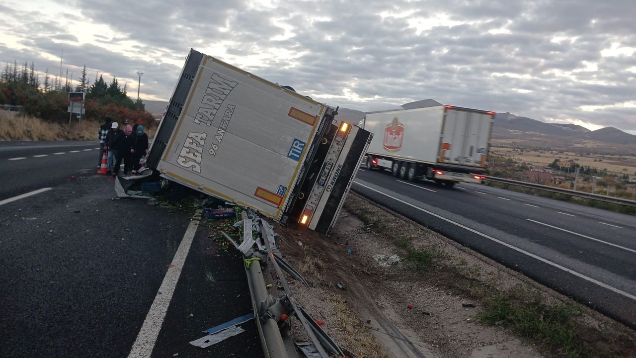 06 DNF 618 plakalı sebze yüklü tır, sürücüsünün direksiyon hâkimiyetini kaybetmesi sonucu devrildi. Devrilmenin etkisiyle tırda bulunan sebzelerin bir kısmı yola ve çevreye saçıldı.