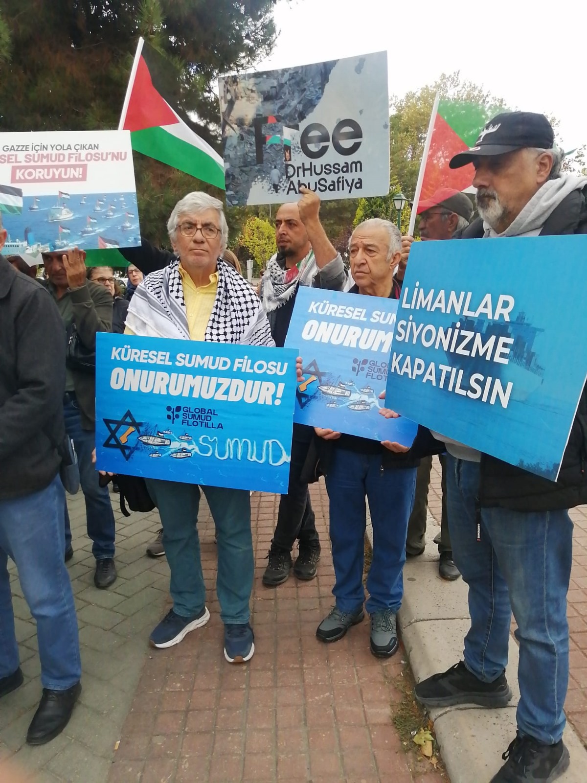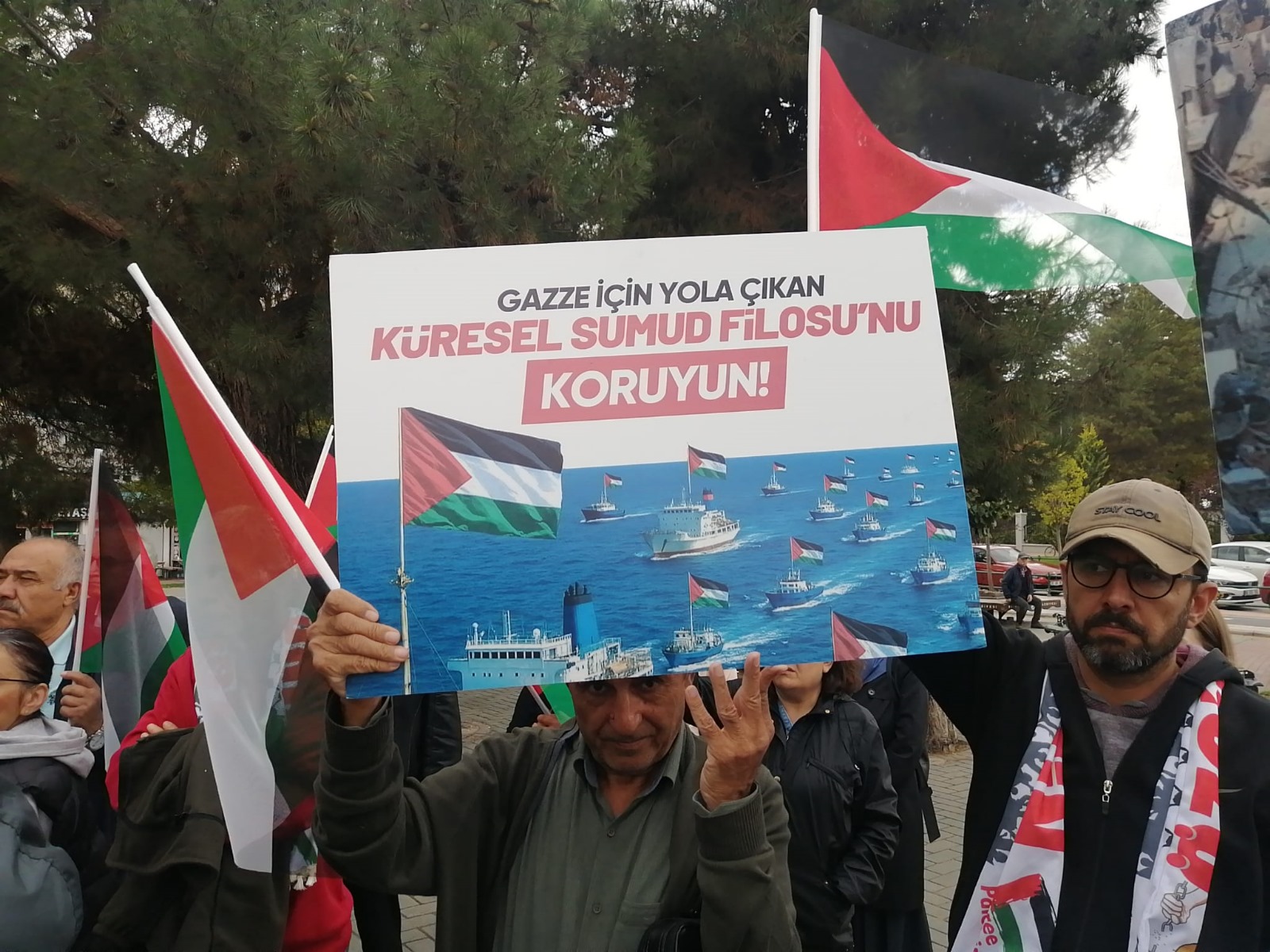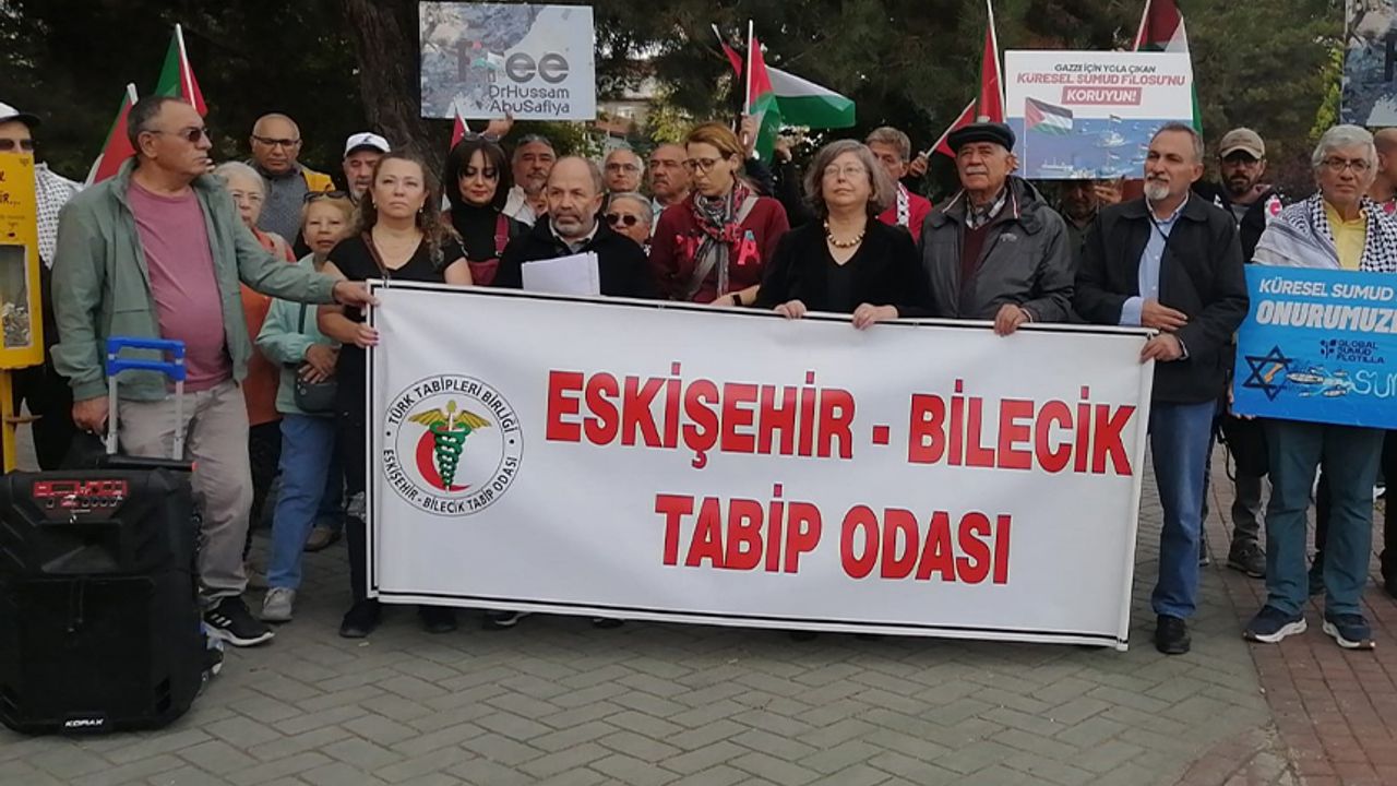 İsmet İnönü Caddesi Ulus Anıtı önünde bir araya gelen oda üyelerinin tepki eylemine, Eskişehir-Filistin ile Dayanışma Platformu, sendika ve bazı dernek temsilcileri de katılarak destek verdi. İsrail’in saldırılarına karşı tepkilerini her platformda ortaya koymaya devam edeceklerini belirten Eskişehir-Bilecik Tabipler Odası Başkanı Nazan Aksaray “Sumud Filosu, İsrail’in Filistin’e uyguladığı soykırımı daha görünür kılmak ve küresel ablukaya isyan etmek için 31 Ağustos günü yola çıktı.1 Ekim gecesi İsrail savaş gemileri tarafından uluslar arası sularda kuşatıldı. Sivil tekneler ile baskın düzenlenerek aralarında ülkemizden giden çok sayıda kişinin de yer aldığı 484 aktivist alı konuldu. Evrensel insan haklarını hedef alan, temel insani değerlere yönelik bu saldırıyı şiddetle kınıyoruz. Gazze halkını açlığa mahkum ederek yerinden sürmeye çalışan İsrail devlet’inin insani yardım ulaştırmaya çalışan gönüllüleri engellemesi kabul edilemez” dedi.